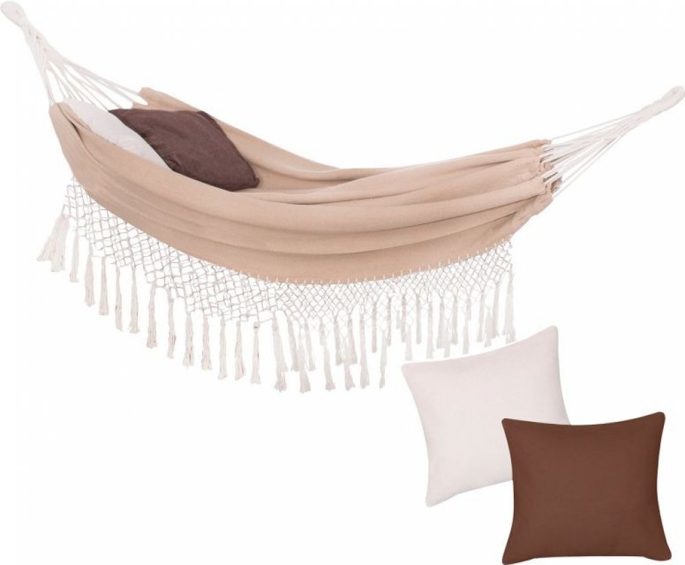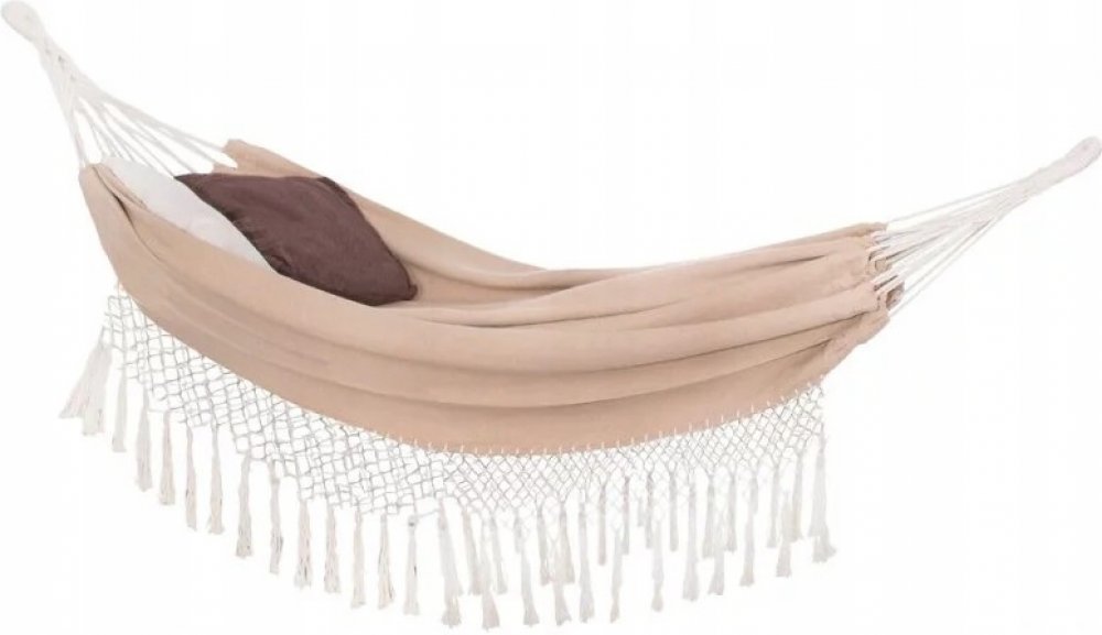 Hamaka je perfektní nápad, jak strávit volný čas v pohodlí domácí zahrady nebo terasy. Maximální nosnost 200 kg, vhodné pro 2 osoby, módní světle hnědá barva. Vyrobeno z bavlny s příměsí polyesteru, prodyšná struktura, pohodlný materiál. Velký rozměr, módní třásně, lehká hmotnost, snadno se přenáší.