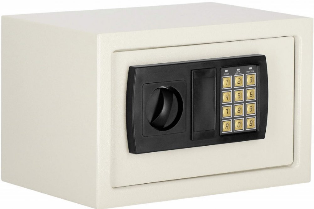 Bezpečností sejf na kód s možností otevření pomocí záložního klíče. Vhodný k uchycení do zdi, do nábytku, na stěnu nebo k podlaze. Trezor má precizní dvoubodový systém zamykání, odolnou silnostěnnou konstrukci a bezpečností pojistku uzamčení. Uvnitř má plstěnnou podložku. Součástí dodávky jsou 2 zál