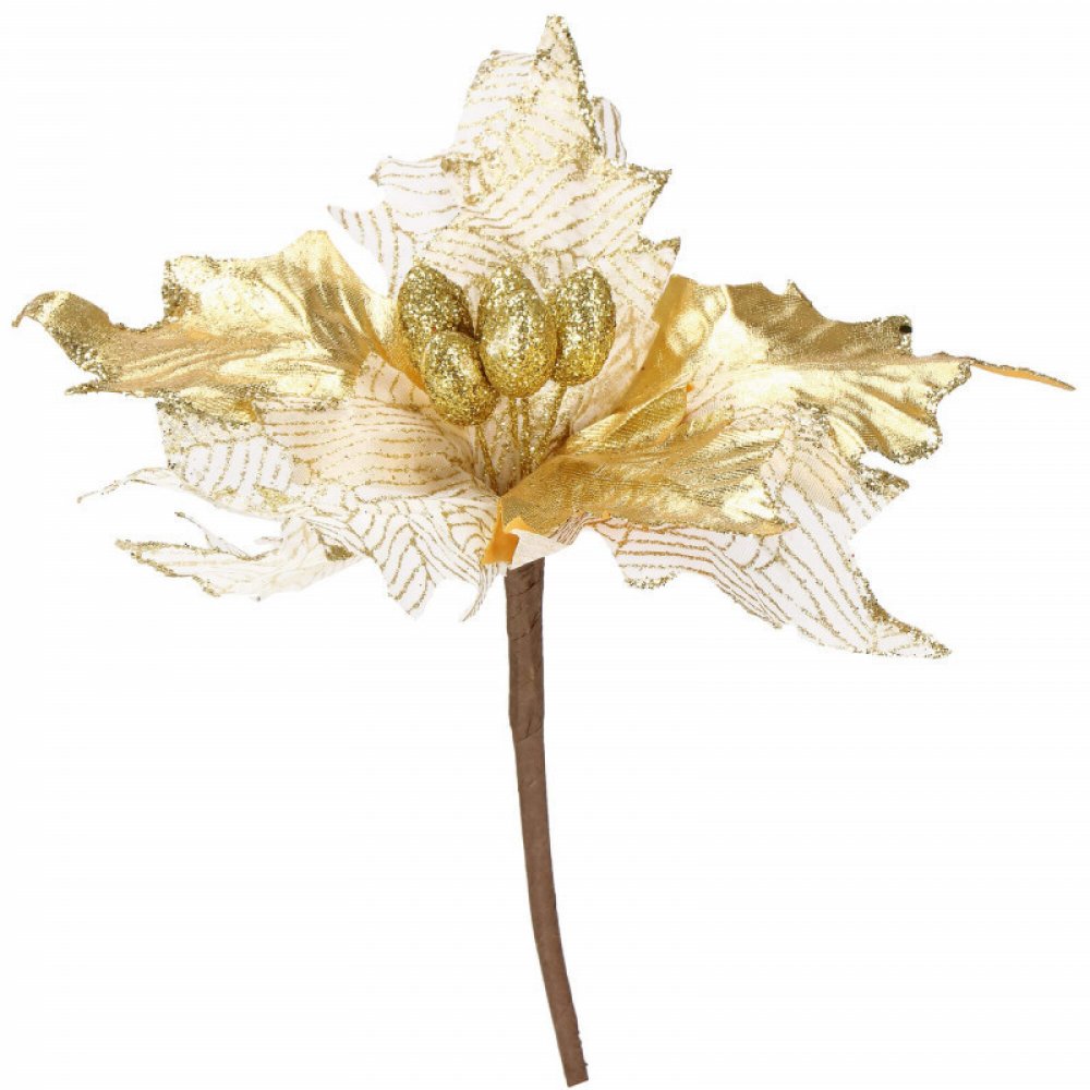 Umělý květ vánoční růže s okvětnímu lístky zdobenými třpytkami. Realistické zpracování, ohebný stonek. Vhodné do různých vánočních aranžmá, k výzdobě stromečku nebo jako samostatná dekorace. Velikost 24x26 cm, zlatá barva.
