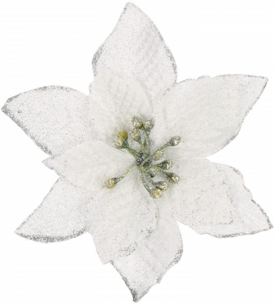 Umělý květ růže na klipu dokonale doplní vánoční výzdobu. Detailní provedení, elegantní třpytky, spodní klip pro snadné uchycení. Velikost 13x13 cm, bílá barva.