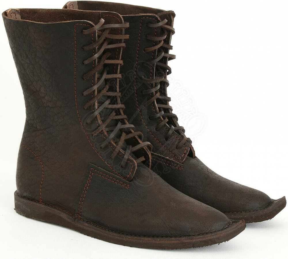 Ačkoliv je tato obuv přizpůsobena moderním nárokům na pohyb v terénu, její vzhled čerpá z gotické módy 14. a 15. století. Mírně prodloužená a zvednutá špička odkazuje na tehdy tolik populární škorně (zobákové boty), avšak v umírněnější formě, která nebrání v přirozené chůzi ani v boji. Přední šněrování pomocí kožených tkaniček umožňovalo již ve středověku perfektní fixaci nohy. Výrazná textura (tzv. zrnitost) hovězí kůže dodává botám drsný, rustikální vzhled, ideální pro postavy trávící většinu času na cestách nebo v polních táborech.