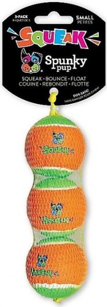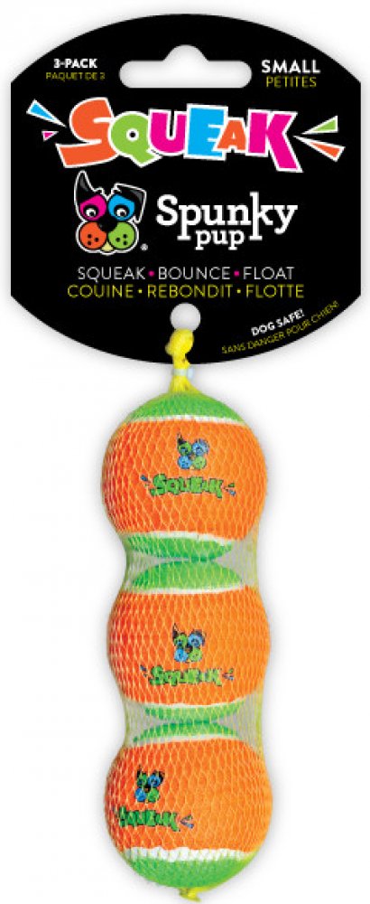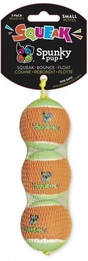 Spunky Pup tenisáky jsou bezpečné hračky pro vašeho pejska, nejsou naplněny žádným nebezpečným plynem a pod tlakem. Pískátko nezapadne dovnitř balónku. Jsou vyrobeny z polyesteru a gumy.