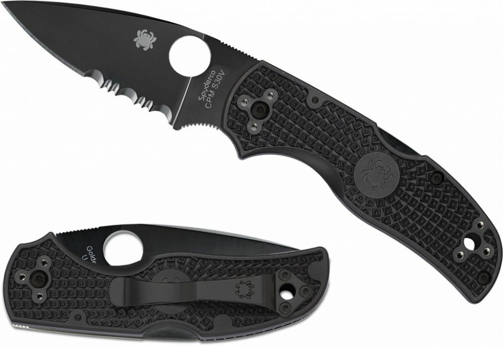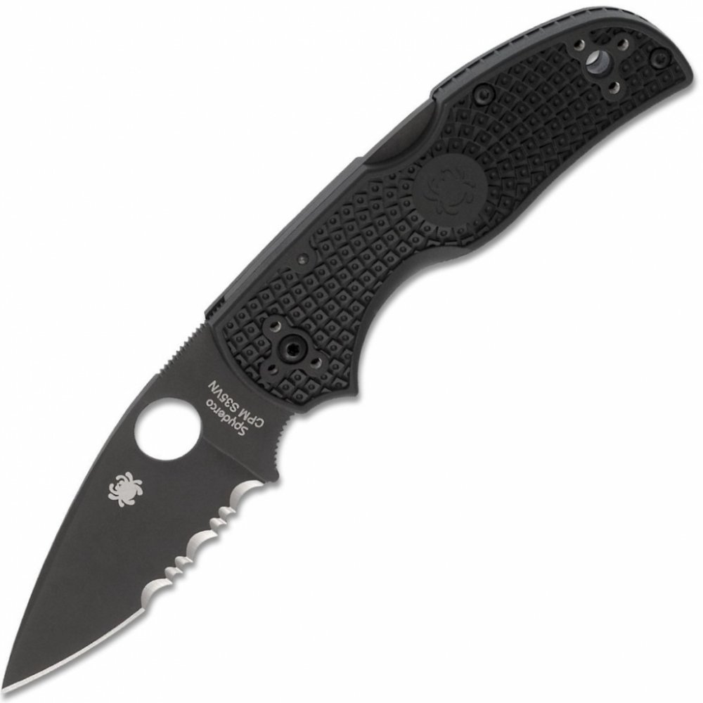 Čepel nože je vyrobena z oceli CPM-S30V, s černým, matným povlakem. Je stažena od horní hrany čepele, což pomáhá většímu řeznému výkonu. Ozubení sahá do poloviny řezné hrany. Oceníte jej při řezání lan a provázků. Nůž se otevírá kulatým otvorem na čepeli, tak charakteristickým pro Spyderco. Čepel po otevření zamyká zadní zádová pojistka - Back Lock. Rukojeť je z černého materiálu FRN. Je mírně tvarovaná s jemnou protiskluzovou úpravou. Pro větší pevnost jsou střenky podloženy zapuštěnými ocelovými vložkami. Klip na sáček je ocelový, černé, matné barvy a je čtyřpolohový, což znamená, že máte čtyři možnosti upevnění. Dírka na rukojeti umožňuje použití šňůrky.