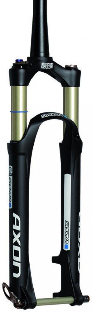 Magnéziové vnější nohy s pevnou patnáctimilimetrovou osou, hliníkové vnitřní kluzáky a konečně hliníková korunka s kónickým sloupkem řízení patří k tomu nej co může Axon nabídnout. Axon ani ve svém cenově dostupnějším, stále však velmi lehkém a odolném provedení nerezignoval na nejnovější technologie a nabízí do puntíku vše, co od moderní vidlice očekáváte. U nejvýše postavených verzí Elite k tomu všemu dále připočtěte dutou horní korunku a pevnou titanovou osu.