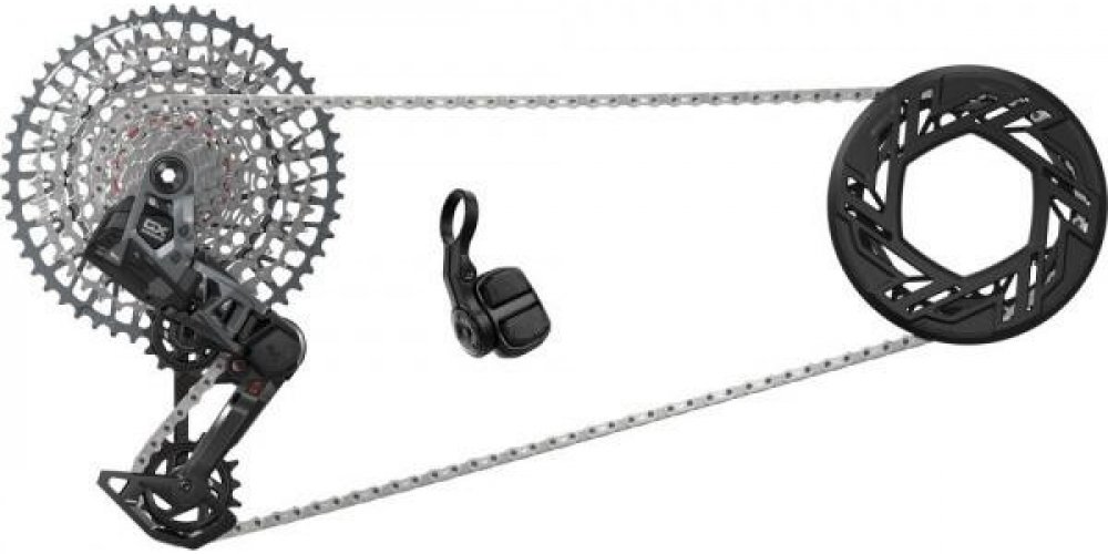 - V balení: přehazovačka GX Eagle Transmission, kazeta GX Eagle Transmission, řetěz GX Eagle Transmission Flattop, ovladač Pod, baterie AXS a nabíječka, převodník 104BCD T-Type 36z