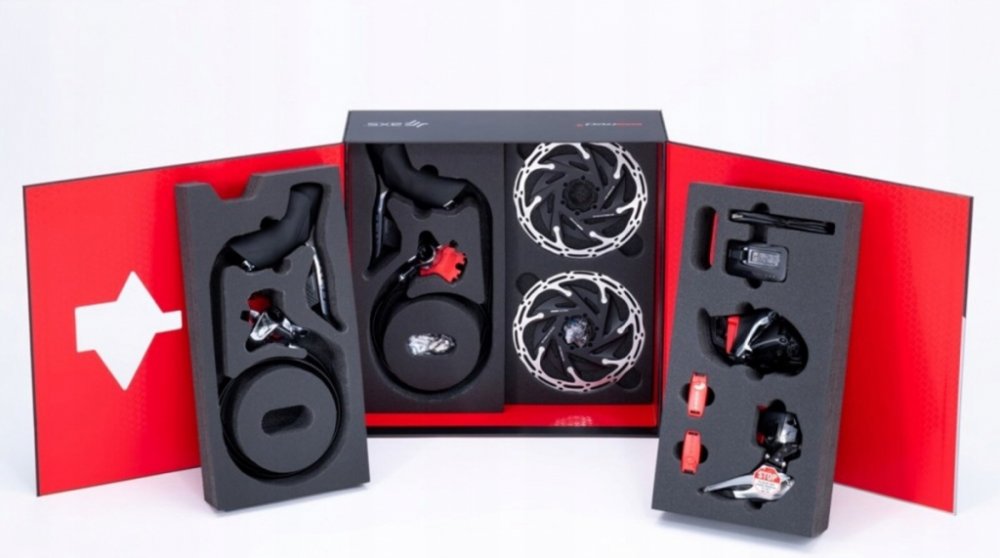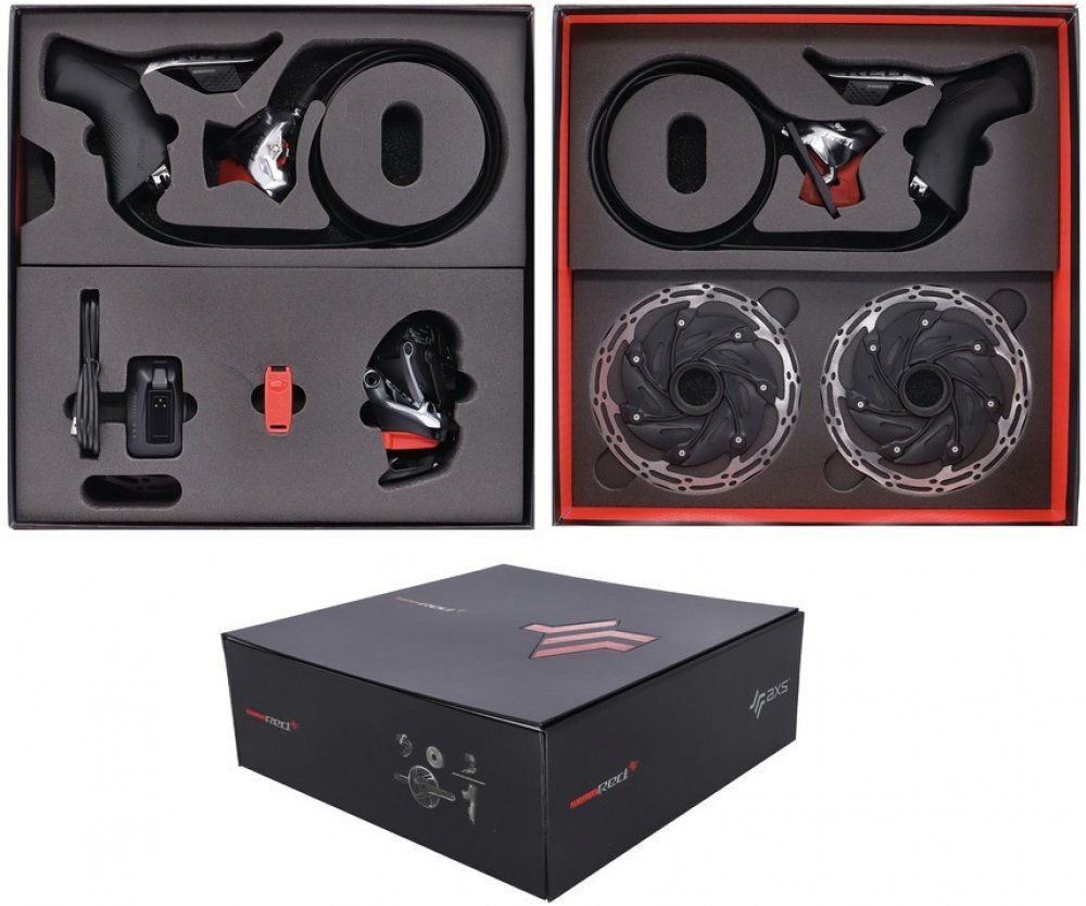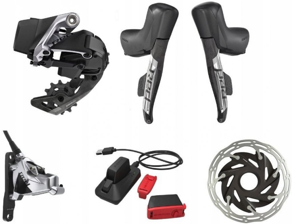 Sada řadicí skupiny SRAM Red eTap AXS 1x12s- včetně řadicí páky, hydraulické kotoučové brzdy, dvoudílného třmenu, Zadní přehazovačky a baterie, 160mm rotor CLX Ti CenterLocking, nabíječka / kabel, stručný návod k použití Sada skupin SRAM "Red eTap AXS 1x", "Road Disc Flat Mount", která se skládá z: Zadní přehazovačka, řadicí/brzdové páky, hydraulické kotoučové brzdy, dva brzdové kotouče Centerline XR Ø 160 mm, středový zámek, baterie, nabíječka s kabelem