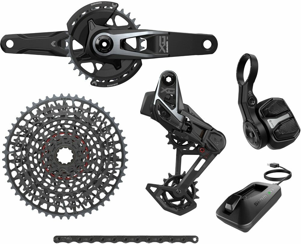Součást balení: Přehazovačka s baterií, nabíječka a kabel, řadící jednotka EC POD Ultimate, kliky X0 DUB MTB Wide, převodník Direct Mount 32T s chrániči, řetěz Eagle 126 článků, kazeta XS-1295 10-52T