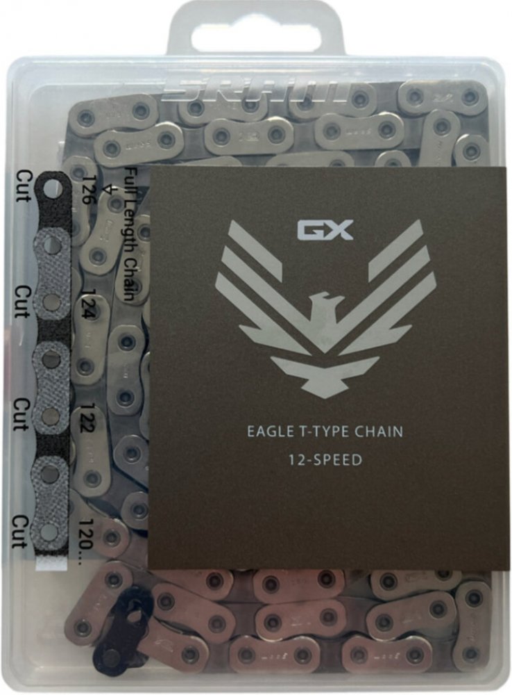 Řetěz GX Eagle Transmission s plochým profilem a pevnými čepy poskytuje nejvyšší úroveň odolnosti a pevnosti pro celodenní jízdy a pro přenášení točivého momentu na E-MTB.