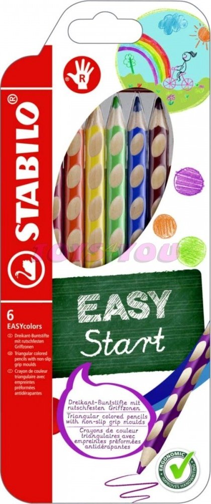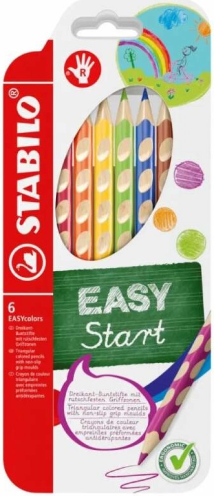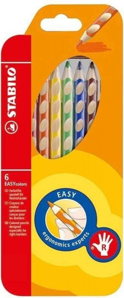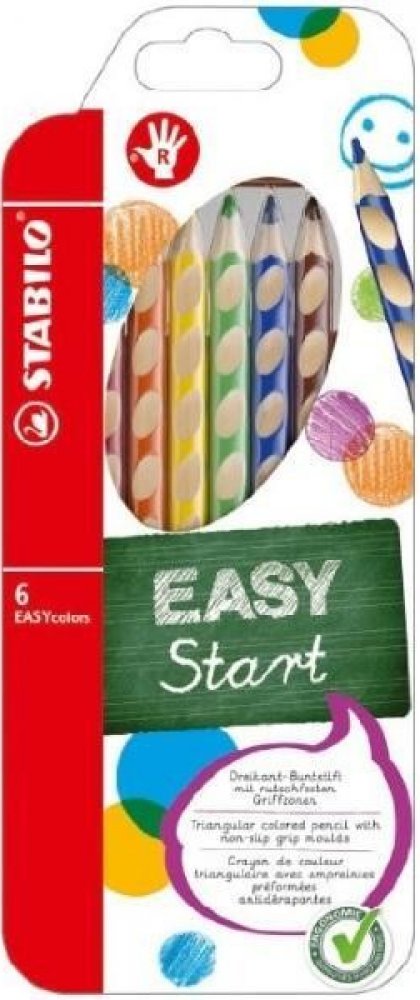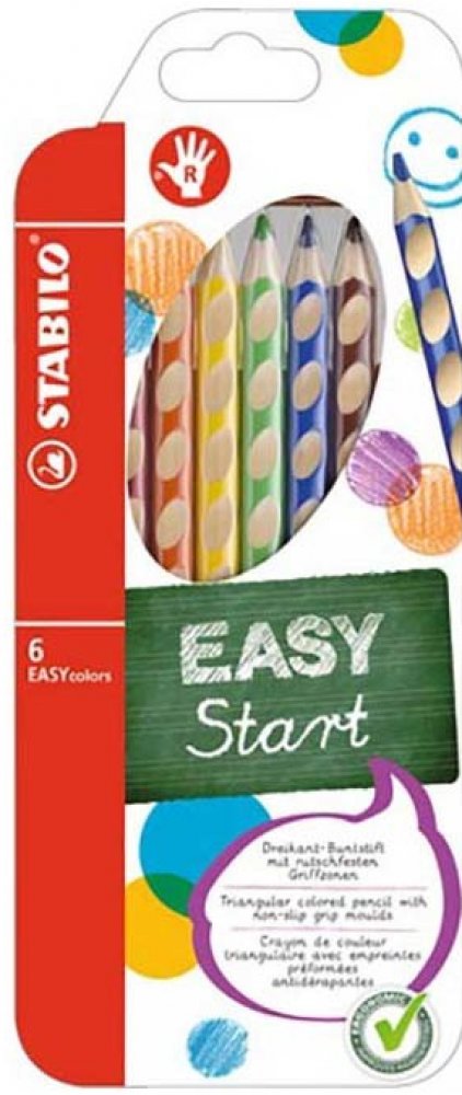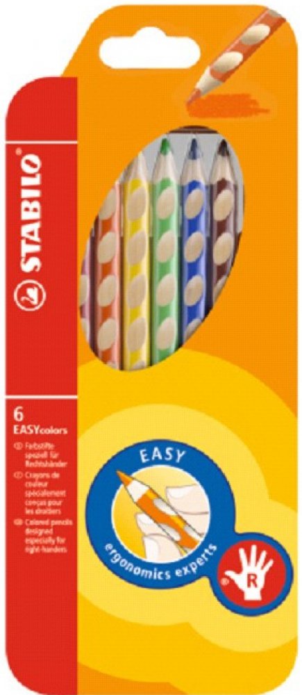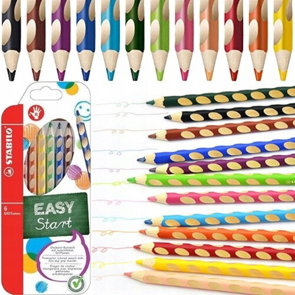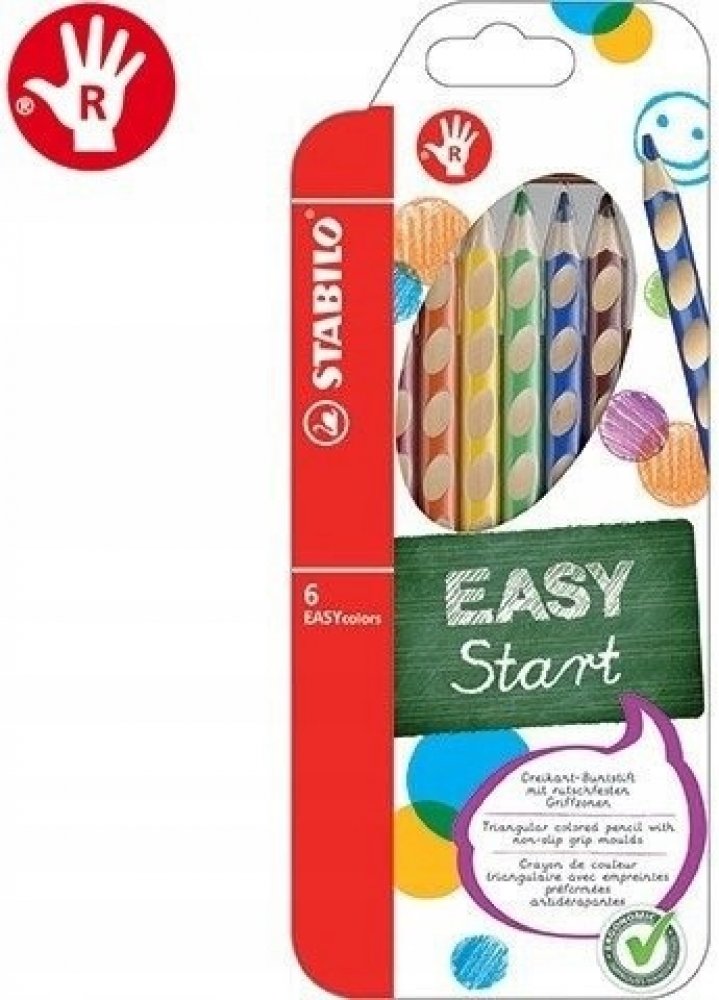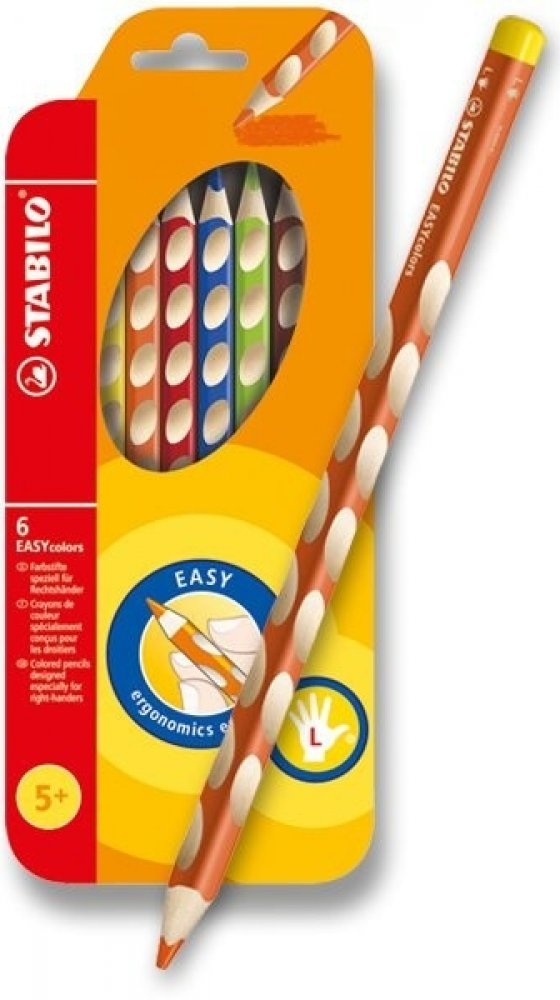 První, ergonomicky tvarované pastelky zvlášť pro praváky a pro leváky. Součást produktové řady STABILO EASYergonomics experts - experti na ergonomii. Trojhranný design a jjedinečné neklouzavé prohlubně zajistí uvolněné držení. Žlutý nebo červený konec jasně signalizuje verzi pro leváky nebo pro praváky. Tuha tvrdosti HB je vhodná jak pro psaní, tak i skicování. Dřevo pochází z trvale udržitleného lesního hospodářství. Na každé tužce je políčko pro vepsání jména. Začít se právným držením tužky? Na to není nikdy příliš brzy. A STABILO EASYcolors vede děti hravou formou ke správnému úchopení tužky. STABILO platí díky úspěchu produktů STABILO EASY a EASYergo za uznávaného odborníka v oblasti ergonomie psaní – u školáků, učitelů a rodičů.