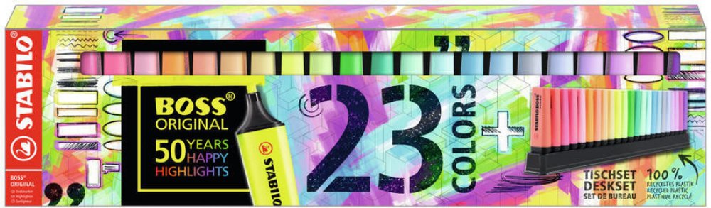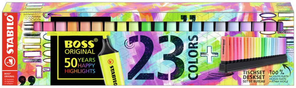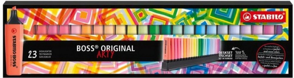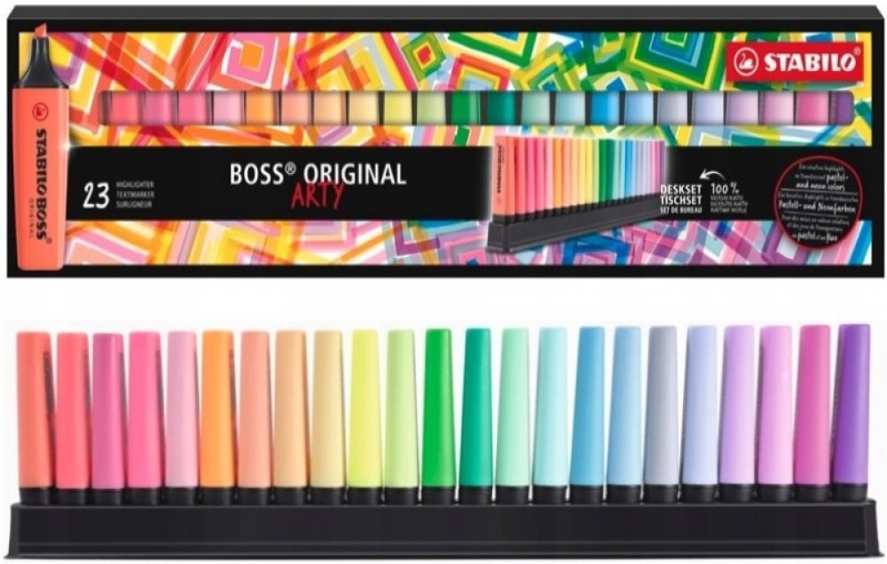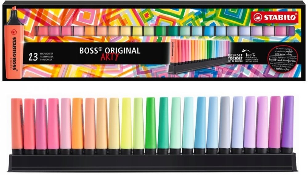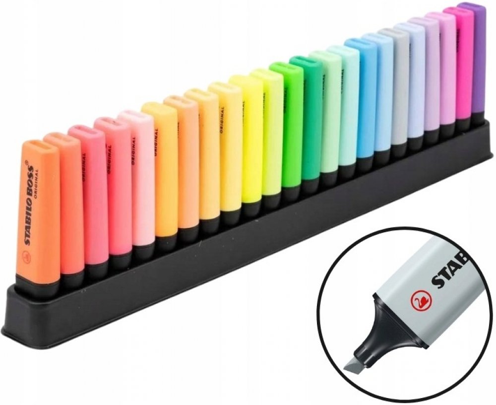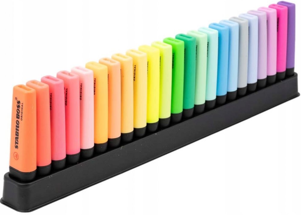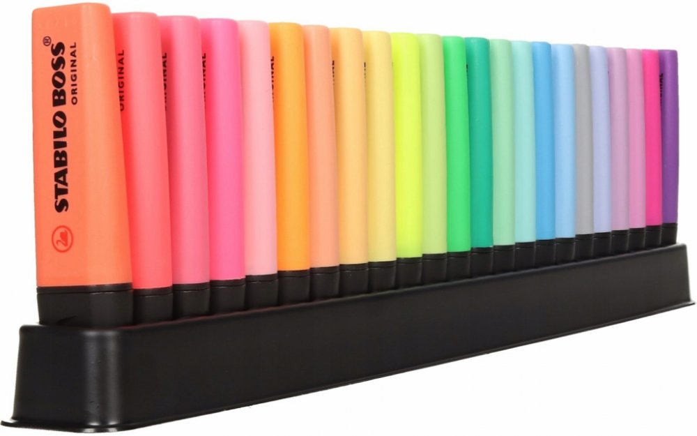 Jedinečný zvýrazňovač v sadě klasických i pastelových barev. Vhodný pro práci s papírem, kopiemi a faxem. Ve 2 šířích stopy - llínový hrot – stopa 2 nebo 5 mm. Zvýrazňovač, který dobře padne do ruky. Vysoká životnost hrotu. Vysoce odolný proti vysychání. STABILO Anti-Dry-Out technologie: 4 hodiny ochrany proti vysychání a pro plnou koncentraci na práci.