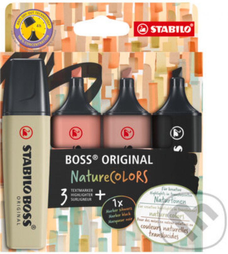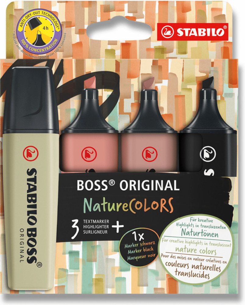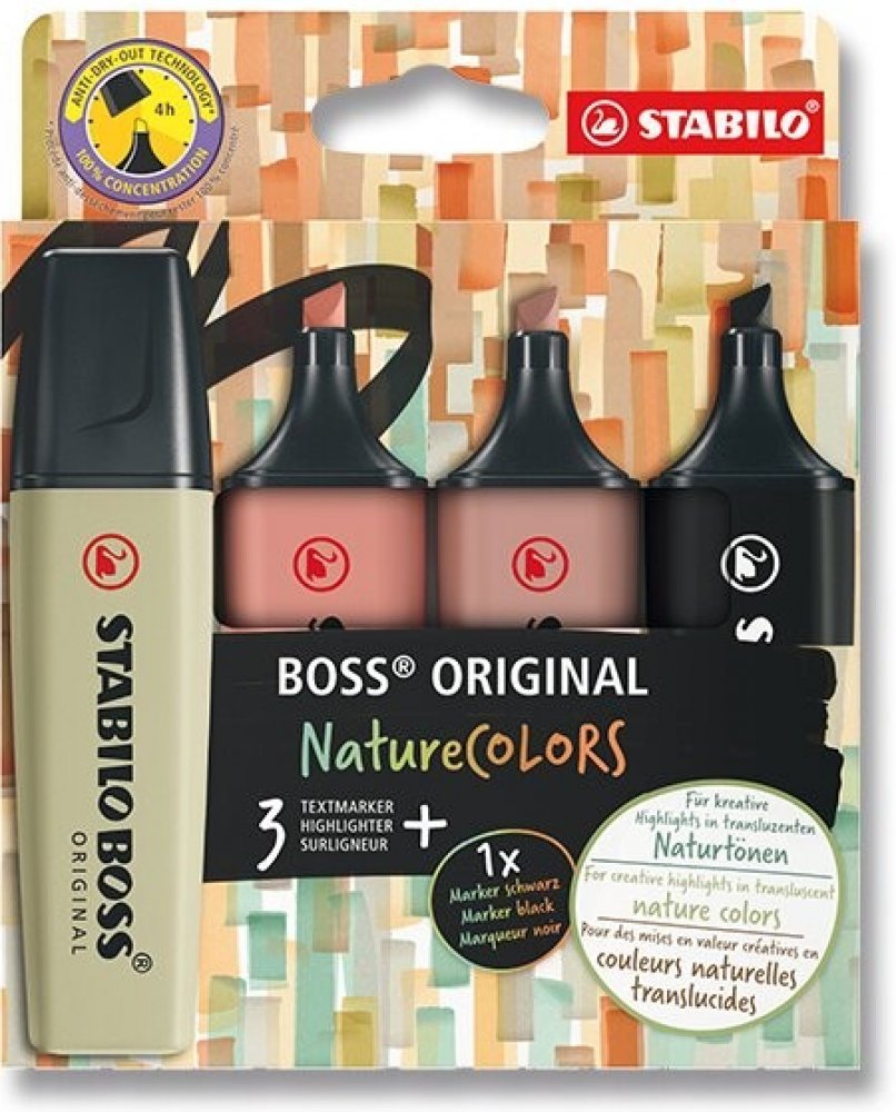 Sada 4 zvýrazňovačů Stabilo Boss Original Nature Colors. Plastové tělo v barvě inkoustu v zemitých barvách. Vysoká odolnost proti vysychání i v otevřeném stavu (až 4 h). Inkoust na vodní bázi, nerozmazává text. Jedinečný zvýrazňovač, který dobře padne do ruky.