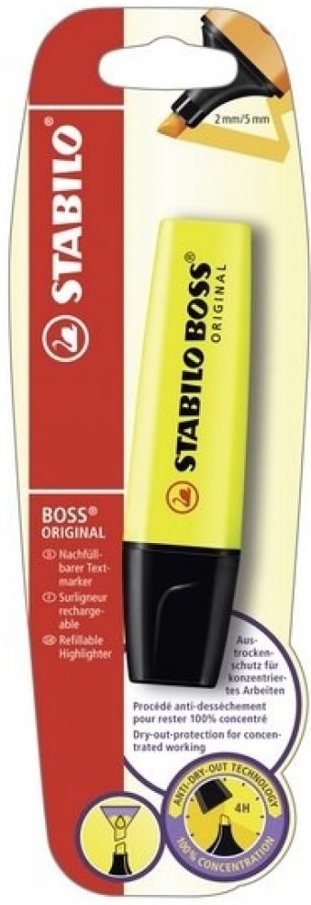 Zvýrazňovač STABILO Boss Original je kvalitní zvýrazňovač, který je vhodný pořídit starším dětem.Zvýrazňovače STABILO Boss Original vydrží až 4 hodiny bez víčka!STABILO BOSS ORIGINAL má jedinečný design a ikonické fluorescenční barvy. Tento "otec všech zvýrazňovačů" se zrodil v roce 1971. Dnes je populární u milionů lidí všech generací. Dobře sedí v ruce, k dispozici je v 9 různých barvách (plus v 6 pastelových odstínech) a lze jej znovu naplnit. Díky technologii STABILO Anti-Dry-Out vydrží bez víčka až 4 hodiny a nevyschne. Jeho náplň je na bázi vody a je zdraví zcela neškodná. Díky těmto vlastnostem je STABILO BOSS ORIGINAL dokonalým zvýrazňovačem, na který se můžete spolehnout.