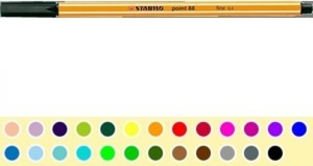 STABILO® point 88® KOLIK BAREV SI JEN PŘEDSTAVÍŠ. Univerzální jemný liner pro školáky, studenty a profesionály. Evropská jednička mezi linery. Nezaměnitelný tvar - šestihranný design s bílými pruhy. Hrot zasazený v kovovém pouzdře pro dlouhou životnost. Šířka stopy 0,4 mm. Vhodný pro psaní a rýsování podle šablony nebo pravítka. Vydrží dlouho bez uzávěru. Prodyšné víčko.