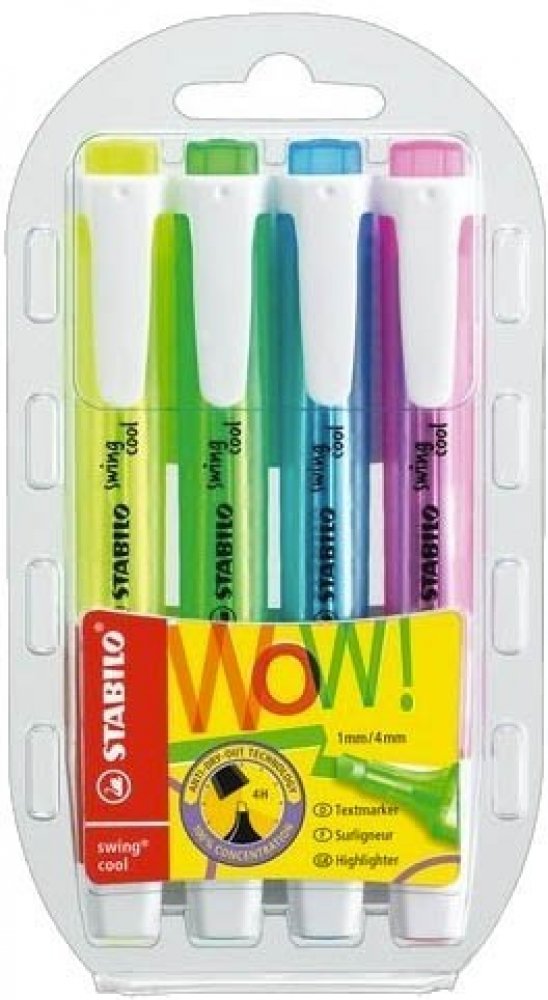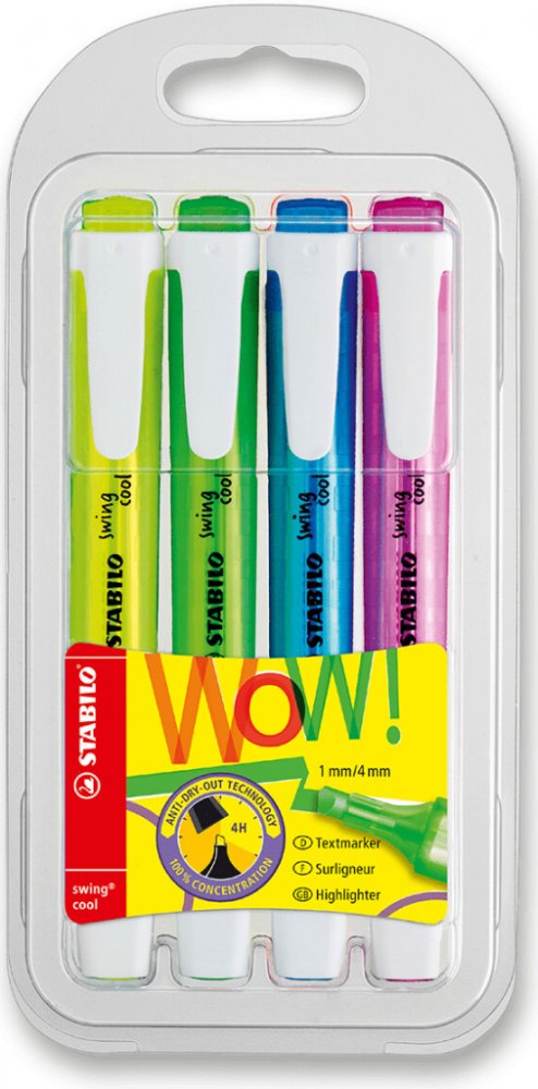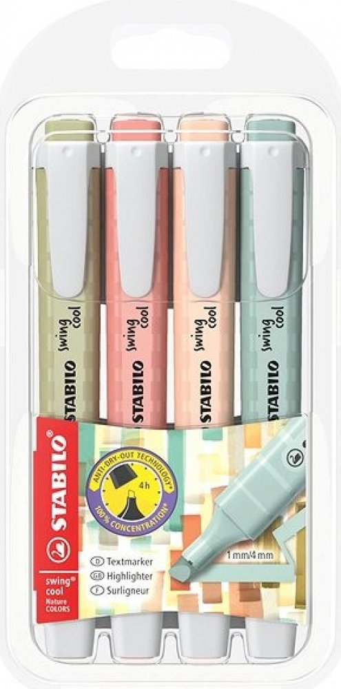 Zvýrazňovač "Swing cool NatureCOLORS" byl inspirován barvami přírody. Kromě tradičního zvýrazňování je ideální pro kreativní psaní, kaligrafii či zvýraznění v deníku. Technologie "Anti-Dry-Out" zajistí, že zvýrazňovač nevysychá po dobu 4 hodin bez uzávěru.
