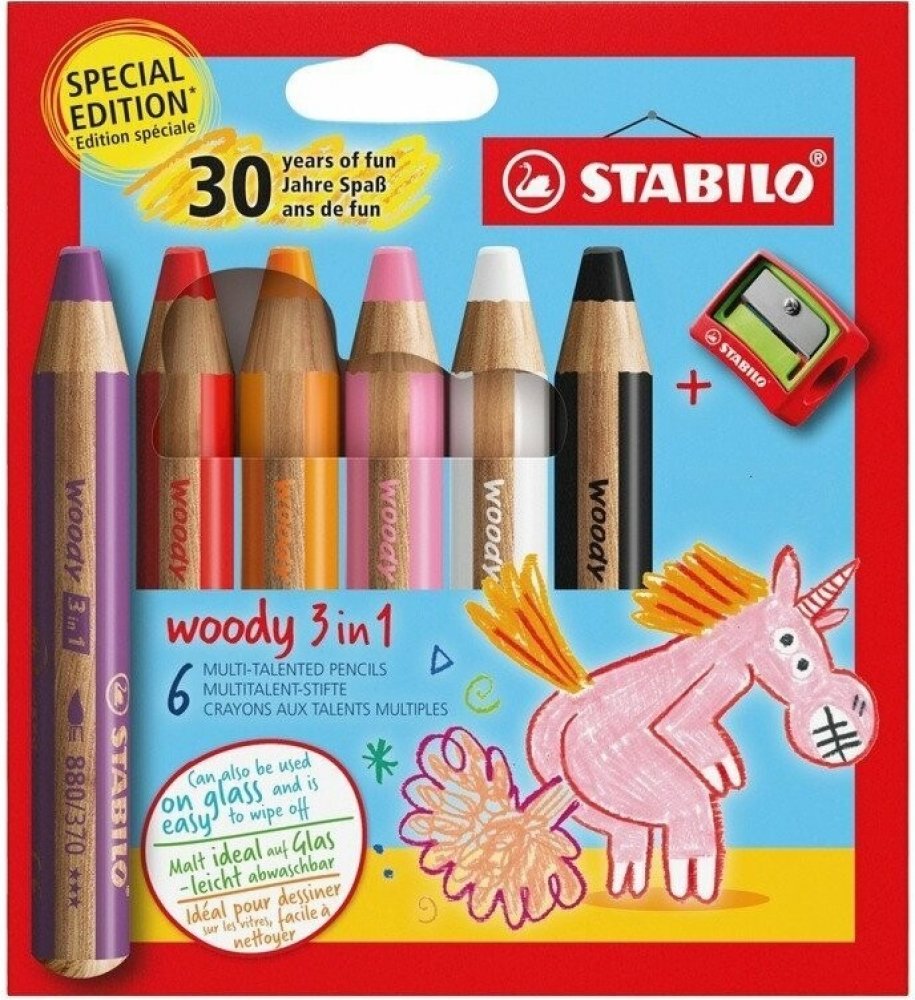 STABILO woody 3 in 1 je mimořádně všestranný produkt: je to pastelka, vodovka a voskovka v jednom. Díky své vysoké intenzitě barev je ideální i na tmavý a černý papír nebo pro vyškrábávací techniku. Dá se snadno rozmývat štětcem s vodou a umí vytvářet unikátní akvarelové efekty. Funguje také skvěle na hladkých površích, jako je sklo a kov, a lze ji z nich snadno odstranit vodou. XXL tuha je uložená v těle vyrobeném ze dřeva certifikovaného PEFC® (PEFC/04-31-1728). STABILO woody 3 in 1 obsahuje 8 krát více barvy než běžná pastelka. Její kulatý a silný tvar je vhodný zejména pro malé dětské ruce.