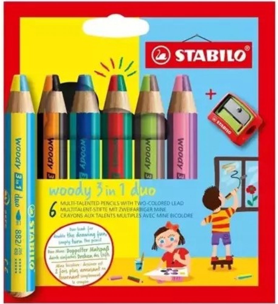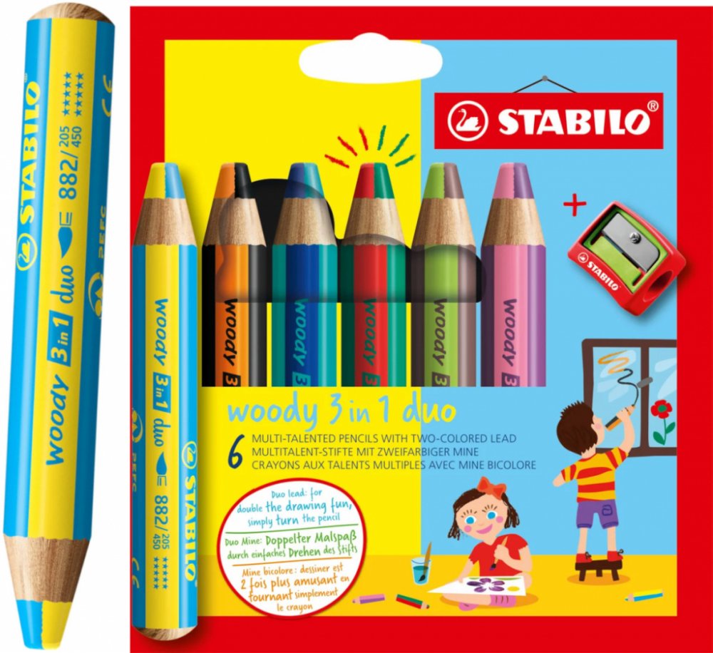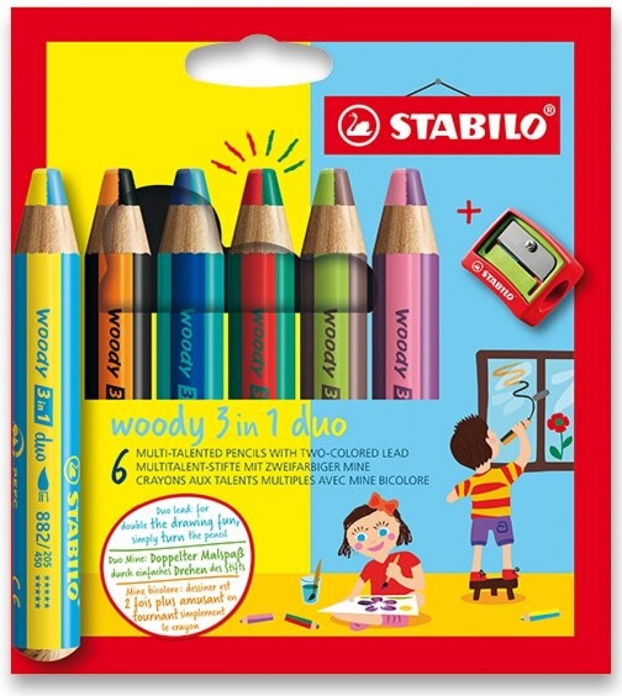 Multifunkční pastelky STABILO woody 3v1 duo pero zaujme svým dvoubarevným provedením! Dvojnásobná barevná zábava je zaručena se všestrannou barvičkou pro malé i velké umělce. Barevné výsledky kreslení vznikají pouhým otáčením Duo tuhou. Jedinečné barevné kombinace zajišťují neomezenou kreativitu. Ve vysoké kvalitě STABILO woody 3v1 duo kombinuje barvičky, vodovky a voskovky v jednom.