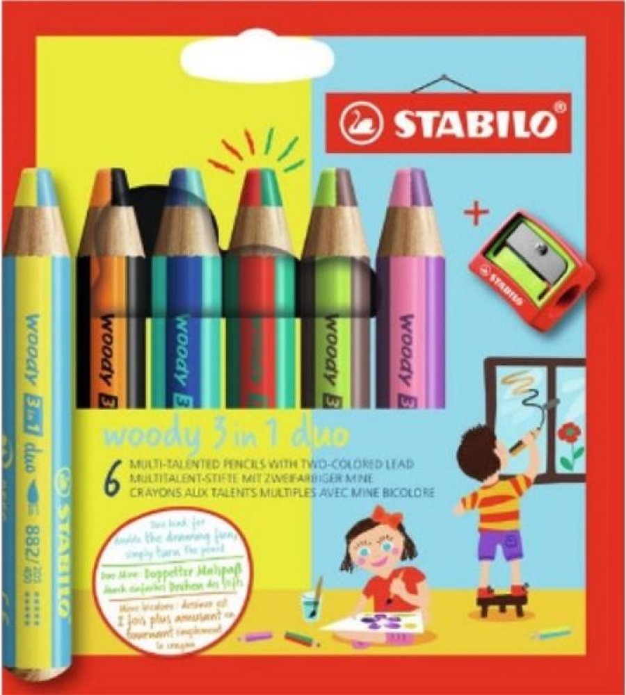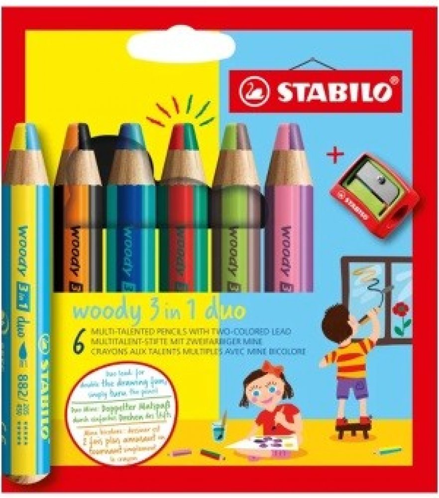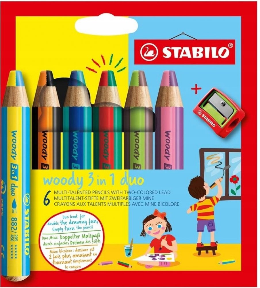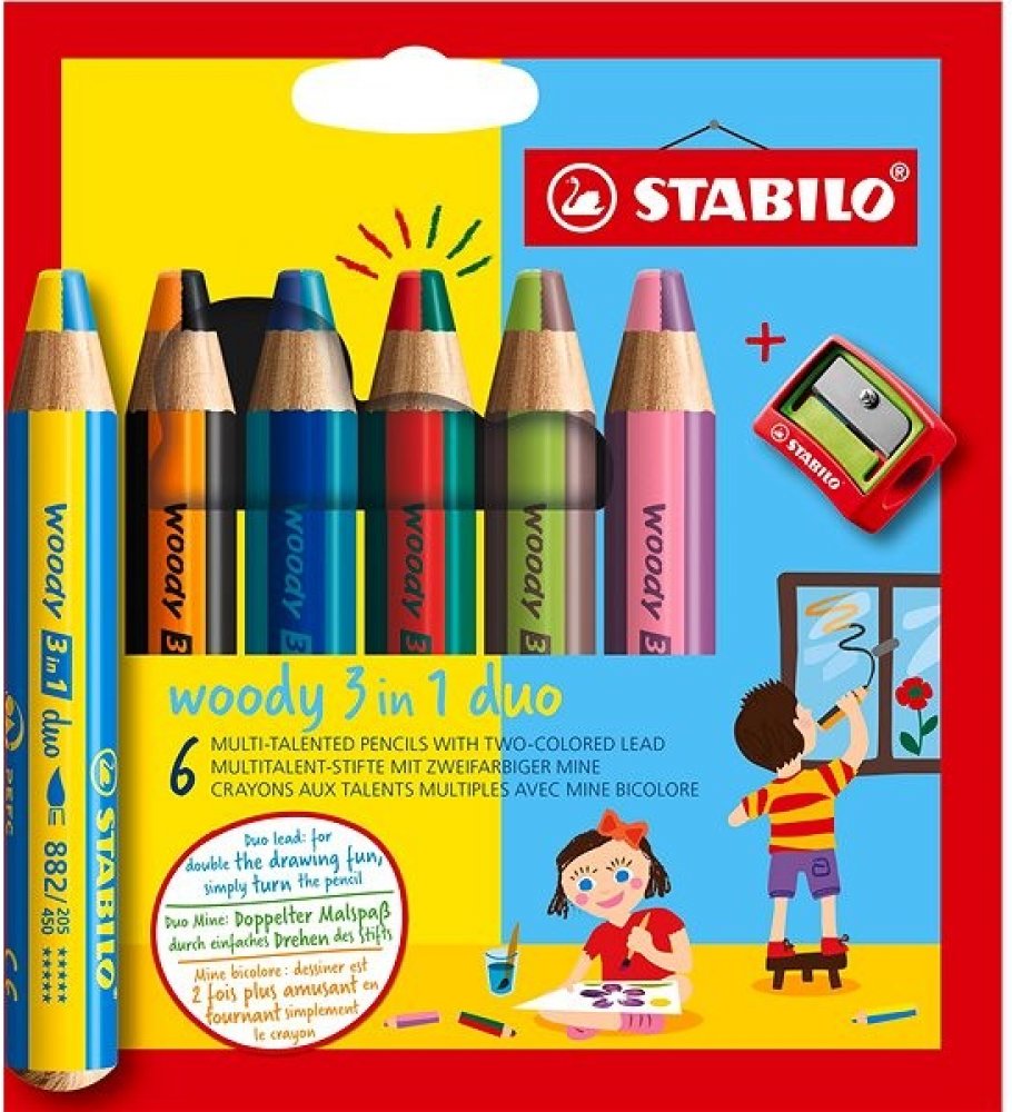 Multifunkční pastelky STABILO woody 3v1 duo pero zaujme svým dvoubarevným provedením! Dvojnásobná barevná zábava je zaručena se všestrannou barvičkou pro malé i velké umělce. Barevné výsledky kreslení vznikají pouhým otáčením Duo tuhou. Jedinečné barevné kombinace zajišťují neomezenou kreativitu. Ve vysoké kvalitě STABILO woody 3v1 duo kombinuje barvičky, vodovky a voskovky v jednom.