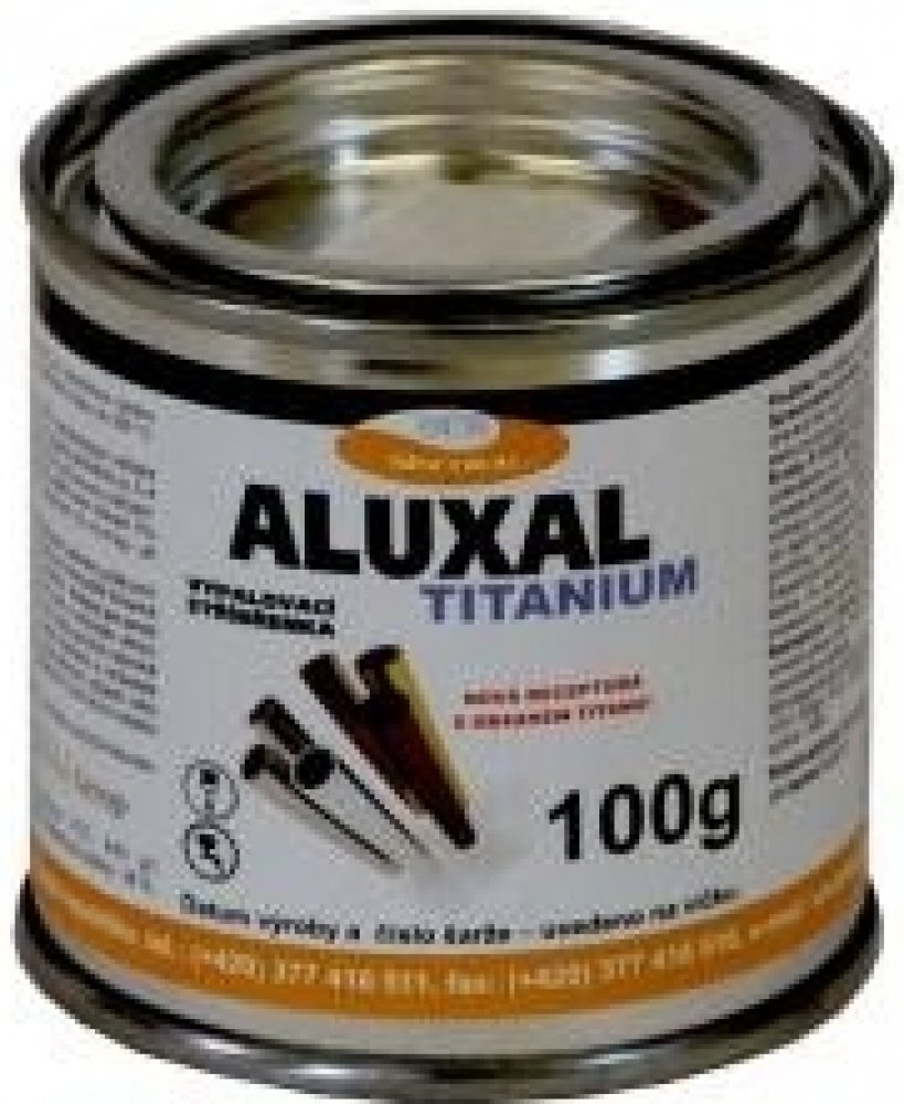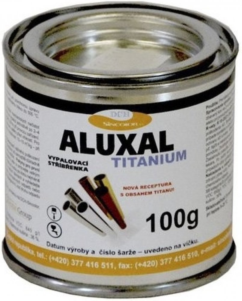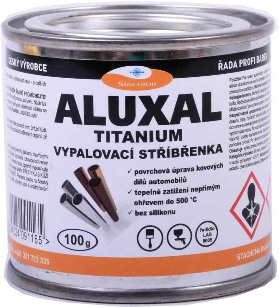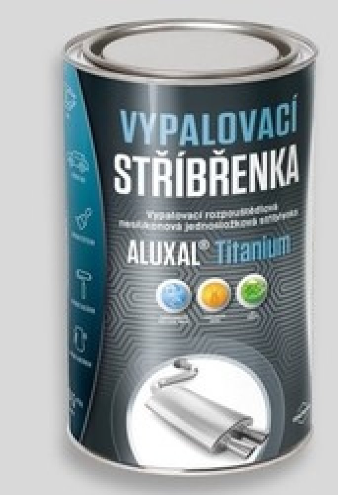 Stachema Aluxal Titanium vypalovací stříbřenka je jednosložková nesilikonová vypalovací stříbřenka určená pro nátěry vystavené nepřímému ohřevu do 500 °C, např. pro výfuky automobilů, plechové komíny apod. Možno použít i v nevytvrzeném stavu jako dočasnou antikorozní ochranu. Řědění stříbřenky Aluxal Titanium:xylén, není nutné ředit Aplikace a ředění stříbřenky Aluxal Titanium:Štětec, stříkání nebo máčení. Teoretická vydatnost Aluxal Titanium:10 až 15 m² /l při 10 až 15 μm suchého filmu. Spotřeba 100 až 66 g/m². Při mokré tloušťce 50 µm se získá suchá tloušťka filmu 20 µm. Zasychání Alkyton žáruvzdorné barvy:Zasychání: 60 minut při teplotě 20 °C. Přetíratelnost: 24 hodin při teplotě 20 °C. Plné vytvrzení: Pro vytvrzení je nátěr nutno vypálit. Bez vypálení nemá nátěr deklarované vlastnosti. Nechte odtěkat rozpouštědla 2-4 hodiny při 20 °C, poté nátěr vypalte při teplotě 200 °C po dobu 2-4 hodin. Nátěr lze vypálit i přímo při provozu zařízení. Nátěr lze naaplikovat a vypálení provést až po delší době, je-li zajištěna ochrana před vlhkostí. Barvu nanášejte válečkem, stříkáním nebo máčením na připravený podklad. Nepoužívat na - mokré a neočištěné povrchy, staré a silikonové nátěry. Příprava povrchu:Doporučujeme dokonalé odstranění produktů koroze a důkladné odmaštění povrchu. Vhodné je čištění na st. 2 až st. 3, ideálně na tryskání st. 2 ½ (ČSN ISO 8501-1). Fosfatizované povrchy nejsou vhodné, dochází zde ke snížení přilnavosti. Barva není vhodná pro přetírání starých a silikonových nátěrů. Předchozí nátěr je nutno odstranit. Při aplikaci na povrch opatřený silikonovými nátěry dojde po vypálení k odloupnutí barvy. Dioiručená teplota podkladu: min. 15 °C a alespoň 3 °C nad rosným bodem. Nezaschlou stříbřenku lze z nářadí odstranit acetonem. Zpracování:Optimální teplota barvy před zpracováním je 20±5 °C. Před aplikací a při aplikaci je nutno nátěr řádně promíchat, rozmíchat případný sediment na dně obalu. Barvu není nutno ředit. Nejnižší doporučená teplota zpracování: 15 °C.