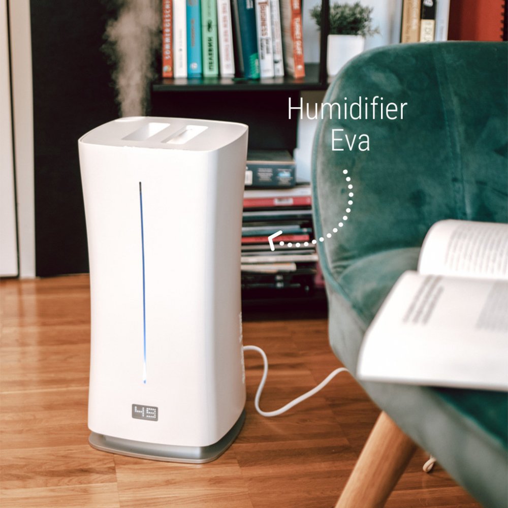 EVA, která je k dispozici v bílém a černém barevném provedení, je však naprosto unikátní z hlediska použité technologie. Jako jediná na světe totiž při automatickém režimu používá adaptivní způsob zvlhčování. To znamená, že čím je rozdíl mezi aktuální vlhkostí v místnosti a nastavenou cílovou vlhkostí na hydrostatu menší, tím nižší výkon EVY je. Výsledkem je, že přístroj udržuje požadovanou vlhkost v místnosti úsporně a v důsledku toho i velmi tiše. Kromě toho je EVA také přesnější než konkurenční zvlhčovače, a to za pomocí externího vlhkostního čidla, které funguje zároveň jako dálkový ovladač k přístroji.