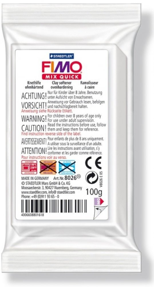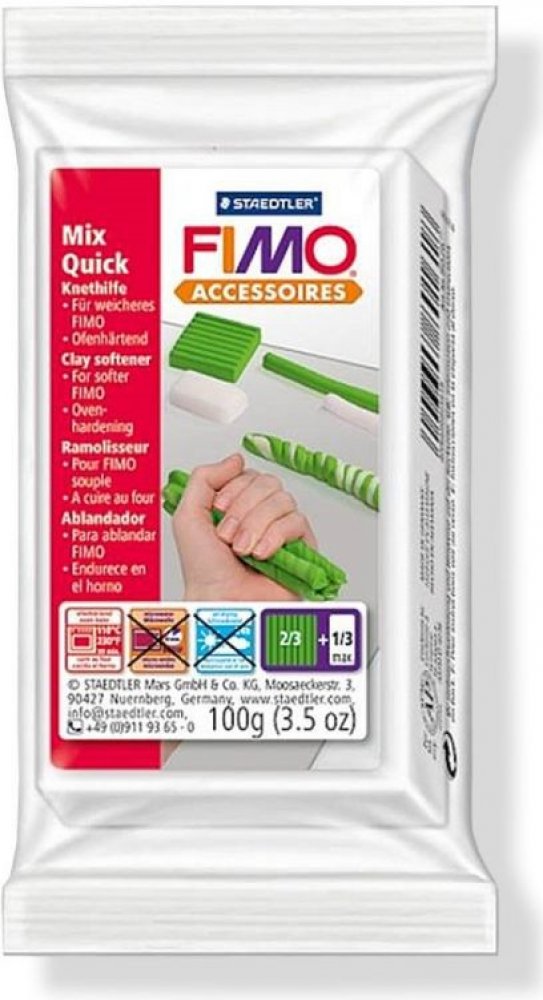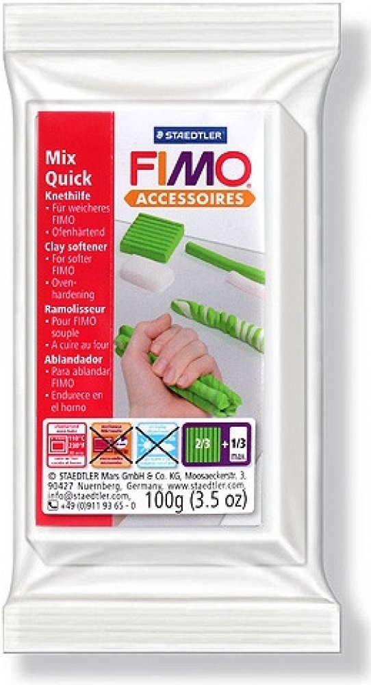 Změkčovač Fimo hmoty. Vhodné zejména při míchání odstínů z FIMO hmoty. Vmíchejte jemně do hmoty Fimo cca 1:3 ale nikdy ne více než 1:2. Přidávejte dle potřeby. Hmotu je také možné nakrájet na tenké plátky a modelovací hmotu Fimo proložit. Pro děti starší 8 let nebo pod dohledem rodičů.