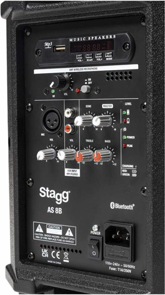 Dvoupásmový aktivní 8" reprobox s vestavěným zesilovačem 125W RMS. Možnost napájení ze sítě nebo pomocí zabudovaného akumulátoru Li 12V/2000mAH, zabudovaný multimediální přehrávač MP3 s USB portem, Bluetooth přijímač s funkcí True Wireless Stereo (možnost BT připojení druhého reproboxu do stereofonního režimu) a FM tunerem, 2-pásmové korekce, 1x UHF ruční bezdrátový mikrofon, echo efekt pro mikrof...