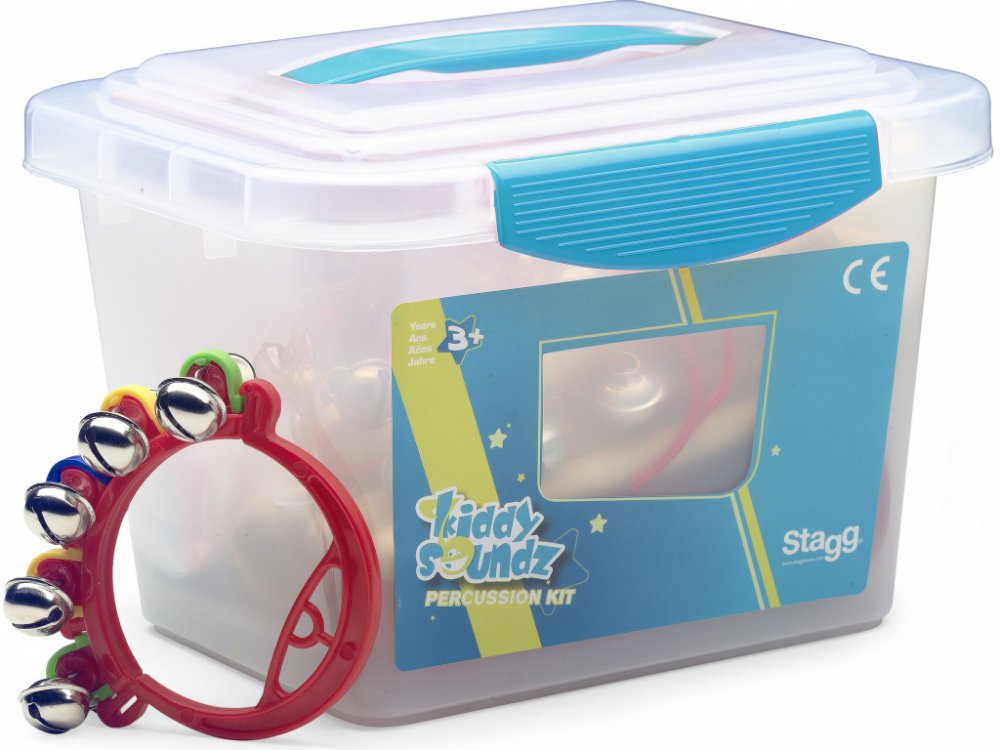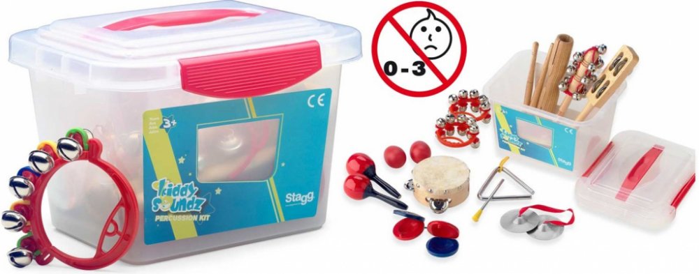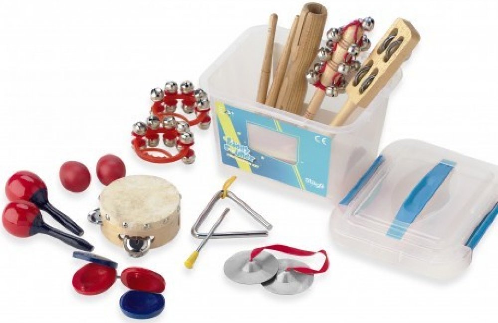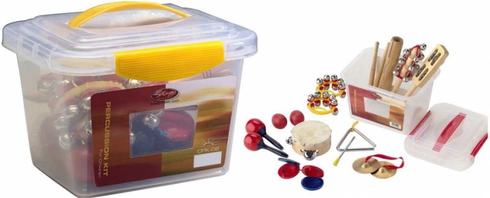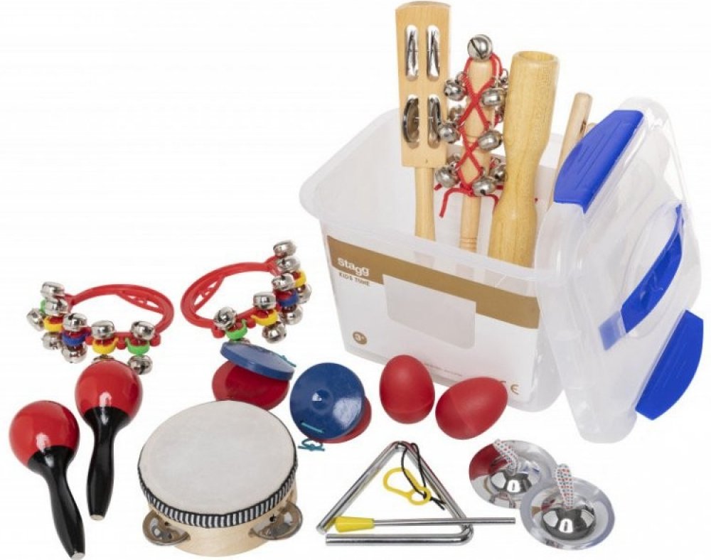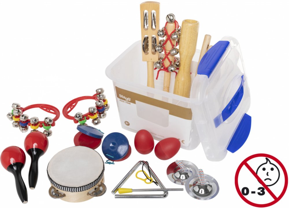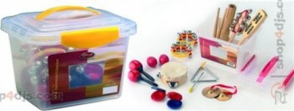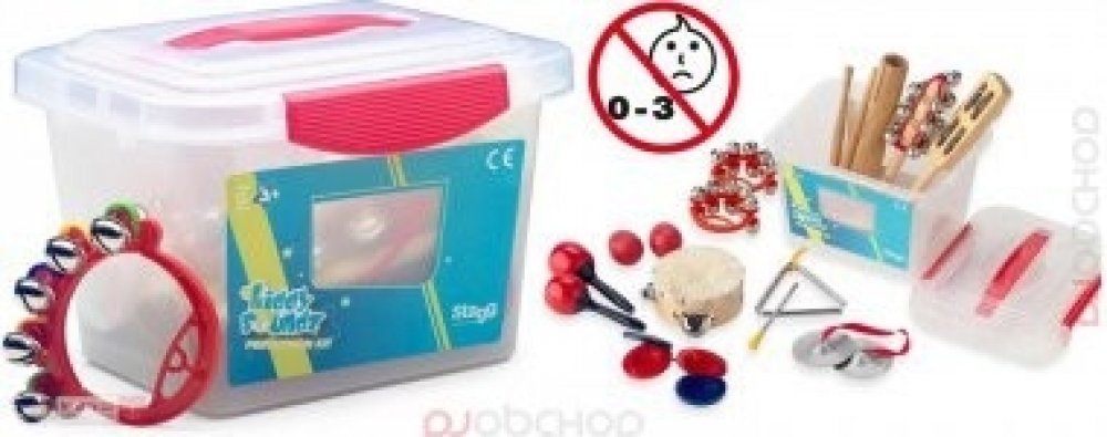 Perkusní sada Dětská perkusní sada Obsahuje: • 1x rolničky na dřevěné paličce• 1x 4" dřevěná mini tamburína s 1 řadou plíšků• 1 x triangl s paličkou• 1x dřevěné dvojité mini guiro s paličkou• 2x mini zvonkohru na plastovém rámu• 1 x zvonky na dřevěném rámu• 1x pár dřevěných castanět• 1x pár činelků• 1x pár plastových mini maracas• 1x pár plastových vajíčkových shakerů• Plastová krabice• hmotnost 1,3 kg.