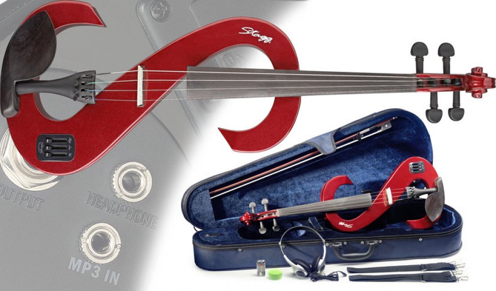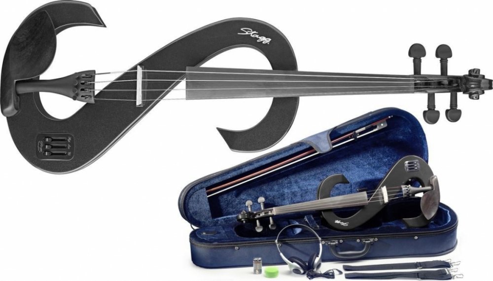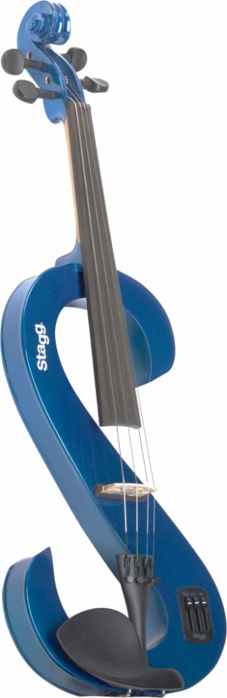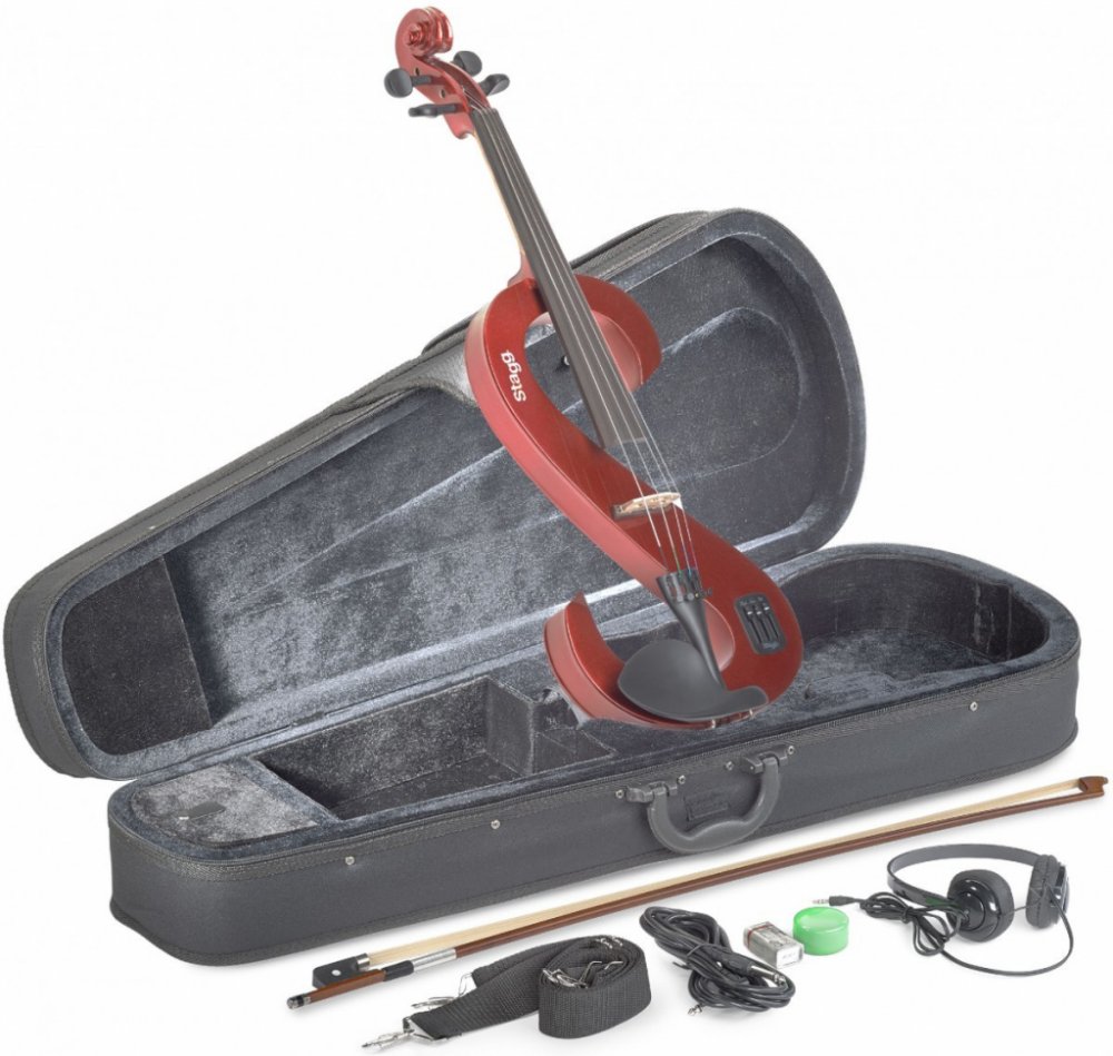 Sada obsahuje elektrickou violu stělem zmasivního javoru v metalické modré barvě, menzura 445 mm, s předzesilovačem sdvoupásmovým ekvalizérem a ovládáním hlasitosti svýstupem jack 6,3 mm a sluchátkovým předzesilovačem svýstupem stereo mini jack 3,5 mm, pouzdro spopruhy, smyčec, kalafunu, stereo sluchátka a 9 Vbaterii.