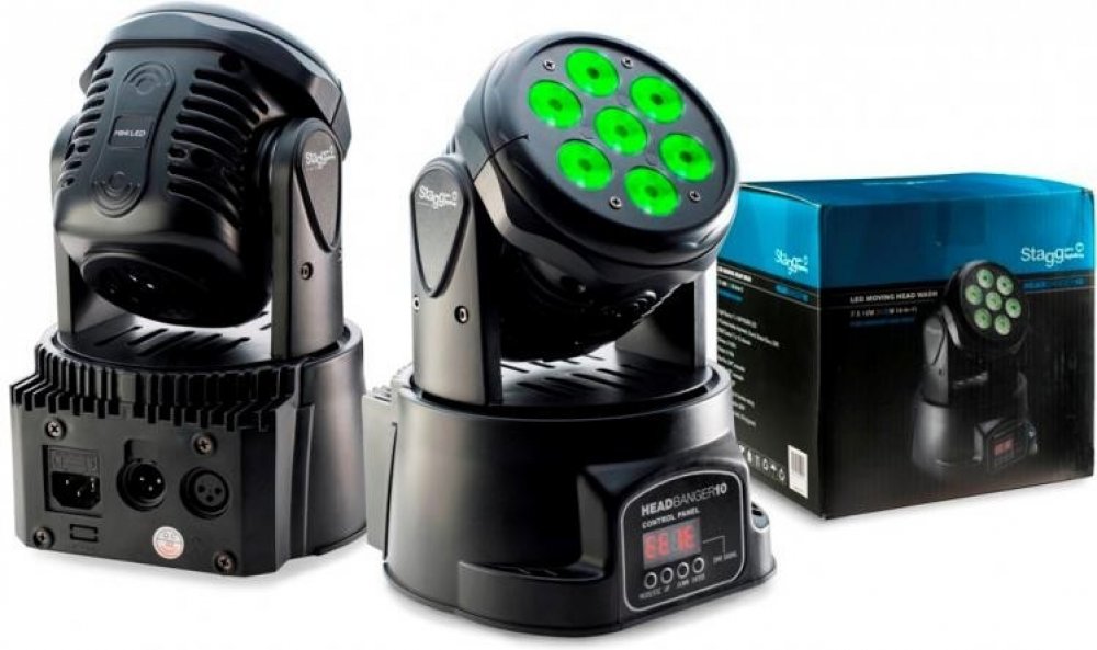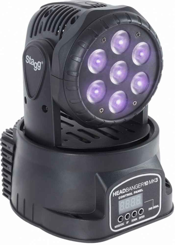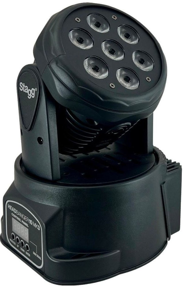 Inteligentní hlava Otočná LED hlava osazená 4-barevnými 10W LED čipy. Ovládání DMX (7/12 kanálů) nebo hudbou, režim Maser/Slave, Auto programy. Ovládání zvukem. RGBW míchání barev, Strobo efekt, funkce stmívání a Colour Macros. Označení výrobce: HEADBANGER10 • Napájení: 230 V AC, 50 Hz• Příkon: 70W• DMX512-připojení: 3pin XLR• Počet LED diod: 7x10 RGBW• Úhel paprsku: cca 25°• Pan: 540°• Tilt: 180°• Rozměry: 270 x 260 x 230mm• Hmotnost: 2,75 kg