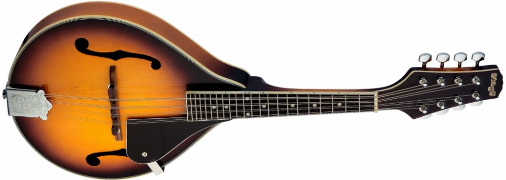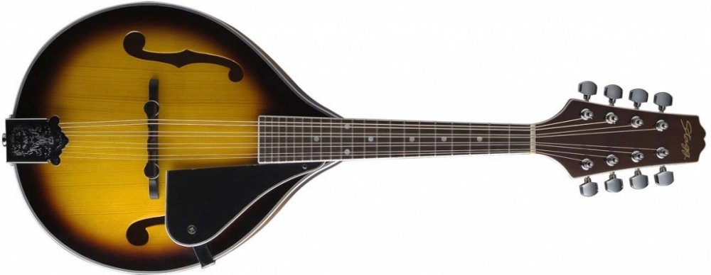 Bluegrassová mandolína. Vrchní deska masiv smrk, spodní deska a luby masiv javor, krk javor, hmatník a kobylka palisandr, otevřené mechaniky. Barva sunburst.