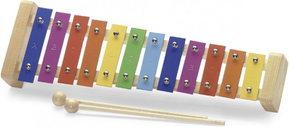 Metalofon s 12-ti barevnými kameny, ladění v rozsahu jedné a půl oktávy A - E1, rám borovice. Součástí dodávky jsou dvě dřevěné paličky. Rozměry 38 x 12 cm. Hmotnost 490 g.