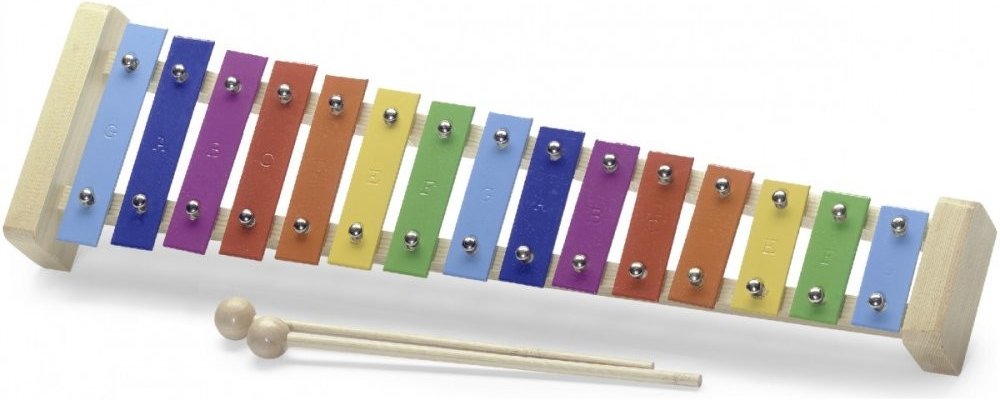 Metalofon s 15-ti barevnými kameny, ladění v rozsahu dvou oktáv G - G2, rám borovice. Součástí dodávky jsou dvě dřevěné paličky. Rozměry 46.5 x 13 cm. Hmotnost 600 g.