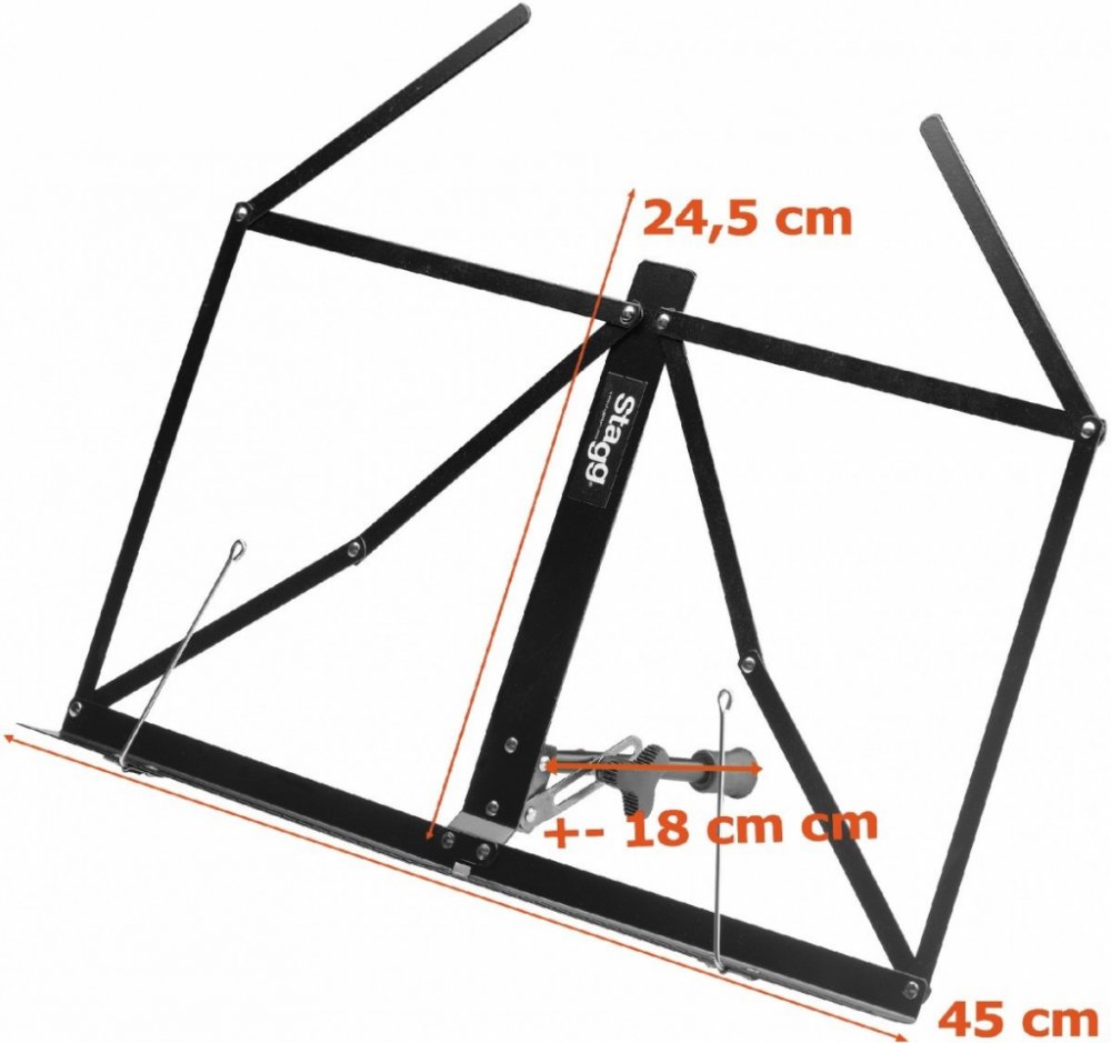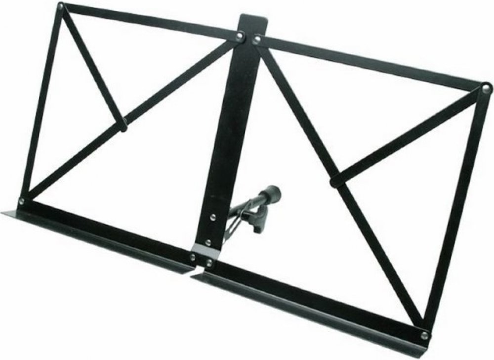 Notový stojan Tento skládací stolní kovový stojan je díky své kompaktnosti a příznivé ceně velmi vyhledávaným zbožím. Navíc k němu obrdžíte pouzdro pro snadný přenos ,Rozměry: 44cm x 26 až 36cm x 10cm ,Hmotnost: 0,4kg ,Rozměry složeného stojanu v pouzdře: 27cm x 8cm x 6.5cm