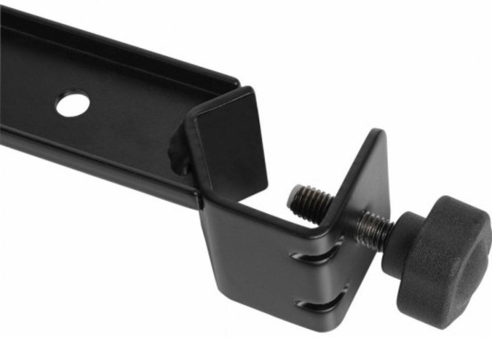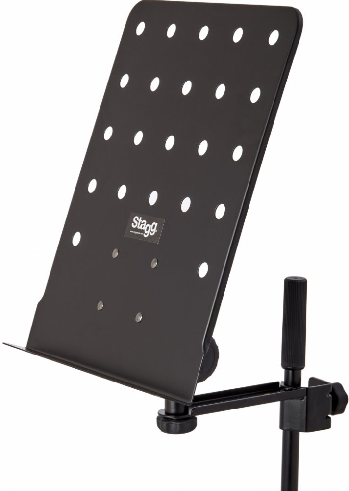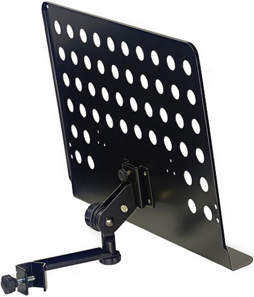 Notový pult s ramenem a šroubem k upevnění na stojan o průměru 14 - 35 mm, rozměry pultíku 31,5 x 24 cm, hmotnost 1,05 kg, černý.