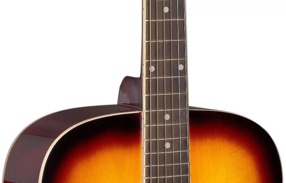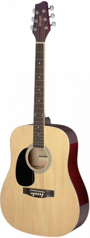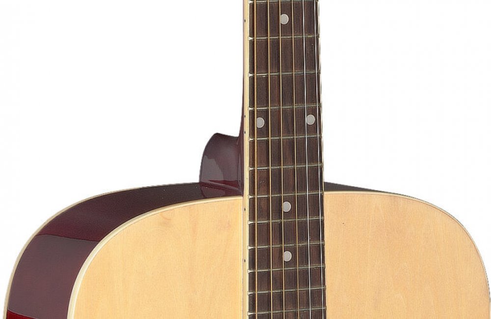 Akustická kytara typu Dreadnought. Vrchní deska lípa, luby a spodní deska lípa, krk nato, hmatník a kobylka mořený javor, mechanika otevřená niklovaná. Barva červená lesklá.
