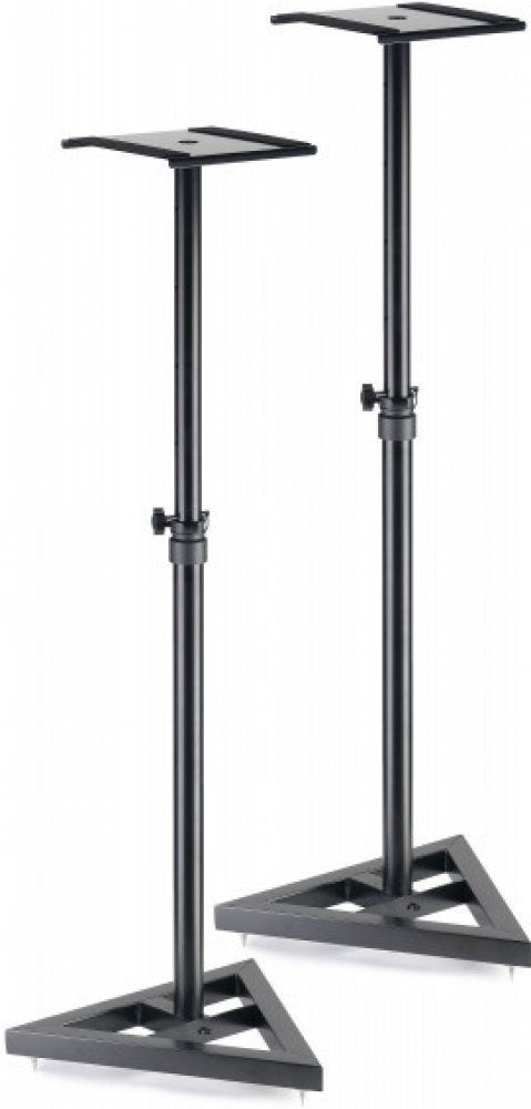 Sada dvou stojanů po studiové monitory. Trojúhelníková základna (3 x 44 cm), gumové nožky s vyrovnávacími kovovými hroty, nastavení výšky v 6-ti polohách v rozmezí 80 - 130 cm, robustní kovová deska (23 x 23 cm) se dvěma protiskluzovými pásky, které zároveň tlumí vibrace při hudební produkci. Max. nosnost 40 kg, kovové provedení, hmotnost stojanu 3,75 kg. Vhodné pro domácí použití, studiové aplikace i mobilní prezentace a akce. Materiál: ocel Výška: 80 - 130 cm Max. nosnost: 40 kg