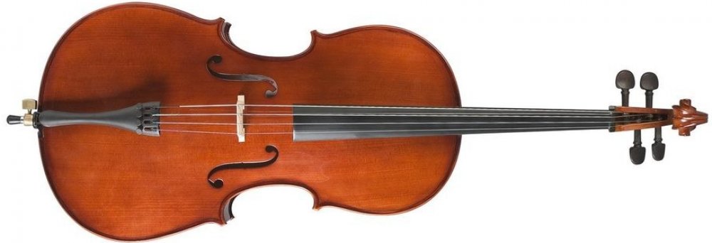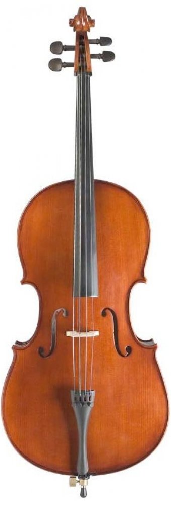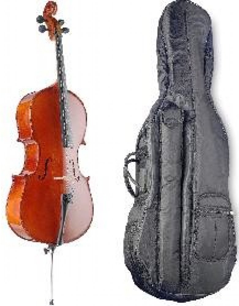 3/4 violoncello. Přední deska masiv smrk, luby a zadní deska javor, krk a kobylka javor, kovový závěs se 4 mechanikami pro jemné doladění, hmatník a ladicí kolíčky z ebonizovaného tvrdého dřeva. Včetně nylonového pouzdra, smyčce a kalafuny.