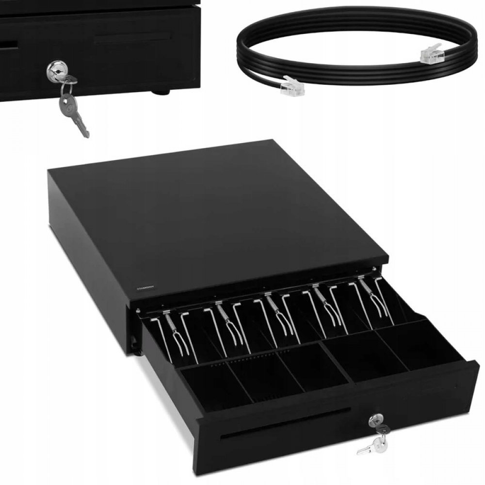 Pokladní zásuvka na bankovky a mince Základem při prodeji je přehledně uspořádaná zásuvka v pokladně. Do této ocelové pokladní zásuvky si můžete samostatně ukládat bankovky a mince a mít je tak vždy na dosah. Celý prodejní proces usnadňuje bezpečný zámek, který se otvírá pomocí pokladní tiskárny nebo pokladního systému. přehlednost – přihrádky na mince 3/5 vždy po ruce – 5 přihrádek na bankovky robustnost – dlouhá životnost, 1 mm silná ocel vyjímatelné přihrádky – přihrádky z odolného plastu ABS lze vyjmout připojení – propojovací kabel s konektorem RJ11 pro připojení tiskárny na účtenky