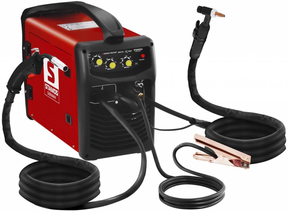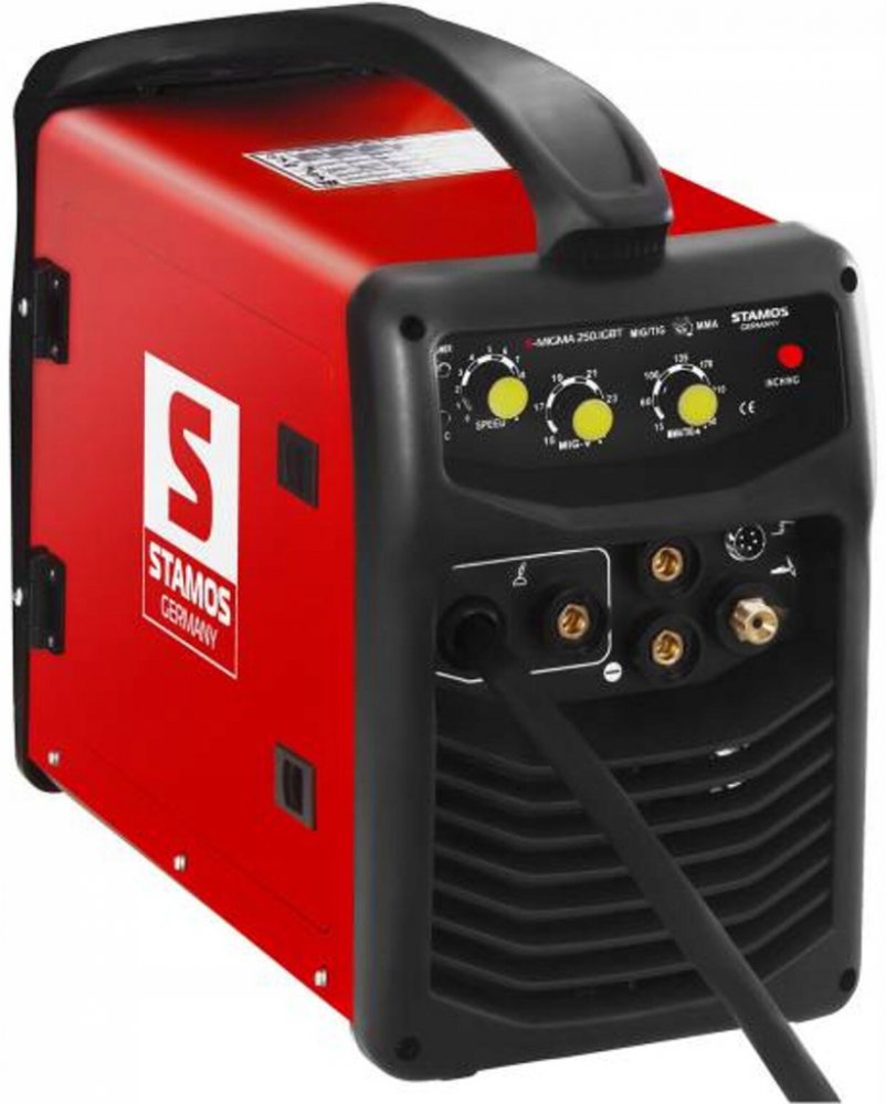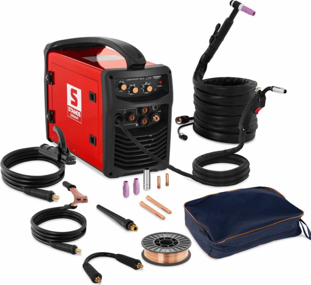 S kombinovanou svářečkou S-MIGMA 250.IGBT od Stamos Germany můžete očekávat profesionální, inovativní a vysoce kvalitní zařízení na různé opravy a udržovací práce. Zařízení kombinuje svařování MIG/ MAG, MMA, TIG a FCAW (svařování trubičkovým drátem) a je tak univerzálně použitelné.Na každou práci s kovy nabízí kombinovaná svářečka S-MIGMA 250.IGBT vhodný svařovací proces. Tenké hliníkové plechy, nebo robustní ocelové nosníky, s plynem nebo bez něho, na stavbě, nebo v dílně , MIG / MAG, TIG, MMA nebo FCAW-vždy máte k dispozici všechny možnosti, jak efektivně a bezpečně spojit všechny kovy.Výkonný IGBT invertor zajistí rychlou změnu svařovacího procesu a umožňuje kvalitní svary s extrémně nízkou mírou chyb. Přehledný ovládací panel vám nabízí maximální kontrolu nad požadovanými svařovacími parametry.Při MIG / MAG svařování je svar chráněn plynem, přičmež jsou při MIG použity inertní plyny a při MAG plyny aktivní. Vyznačuje se vysokou kvalitou svařování, efektivitou a svařovací rychlostí. Dá se použít univerzálně, takže je vhodný na svařování ocelových konstrukcí, ale i na svařování v menším rozsahu.Způsob svařování WIG je velmi přesný a flexibilní. Dá se použít ve všech pozicích, ať již vertikálně, nebo horizontálně a může být použita i na tenké plechy od 0,5 mm. V závislosti na kovu může být použita s nebo bez výplňového materiálu, nízká tepelná zóna způsobuje minimální zkreslení a umožňuje čisté svařování s malým rozstřikem a minimálním upravováním.Elektrodová svářečka disponuje funkcí Hot-Start, která ji po spuštění svářecího procesu automaticky krátkodobě dodává vyšší svářecí proud. Prostřednictvím tohoto "horkého startu" je svárový spoj okamžitě optimálně zahřávaný, aby se elektroda nelepila a od začátku byly zajištěny stabilní a čisté výsledky.Při FCAW svařování je za pomoci trubičkového drátu vytvářený svarový spoj, bez nutnosti dalšího plynu jako ochrany. Tím je zařízení velice pohodlně použitelné, umožňuje svařování v různých pozicích a dá se bez problémů použít i venku. Svářečka je vhodná na různé malé práce s kovy, opravy, nebo základní svařovací práce na automobilech.