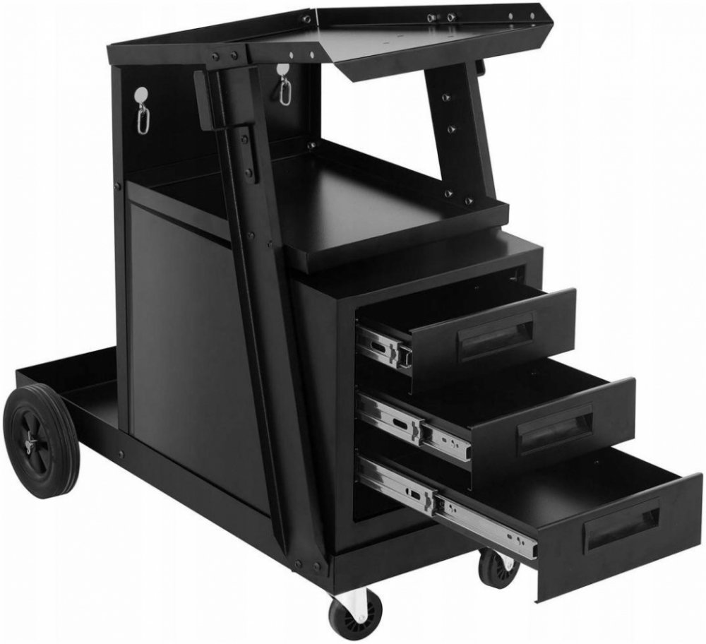 Svářečský vozík se 3 zásuvkami - 75 kg Kromě svářečky potřebujete pro svařování vždy mnoho příslušenství. Podle modelu a metody svařování se neobejdete bez nožního pedálu, plynové láhve, kartáče na strusku, keramického pouzdra, elektrody anebo také řezací trysky. Se svářečským vozíkem SWG-WC-3D výrobce Stamos Germany budete mít vždy všechno po ruce. Zásuvková skříň vám zajistí nejen dodatečný prostor, nýbrž vnese do vaší svářecí výbavy také pořádek. více pořádku i místa díky třem zásuvkám a velké odkládací ploše velká kola pro maximální ovladatelnost ložná plocha pro plynovou láhev se zabezpečovacími řetězy vysoká nosnost do 75 kg ideální pro každou svářecí výstroj a příslušenství dlouhá životnost ocelové konstrukce s černou povrchovou úpravou