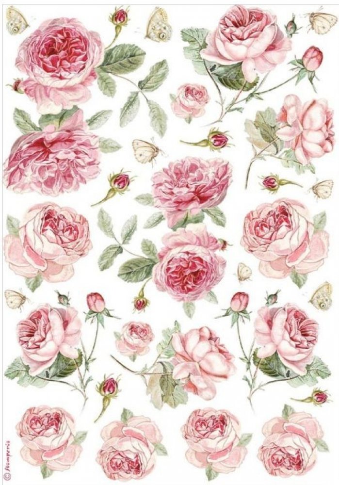 Přírodní rýžový papír na decoupage je na omak sametový a má v sobě viditelná vlákna. Je trochu silnější než tenká vrstva ubrousku a nenasákne ihned lepidlem. Lepí se pomocí lepidla na decoupage na dřevo, lepenku, kov, sklo. Rýžový papír je průsvitný podobně jako jsou ubrousky na decoupage (na rozdíl od papírů na decoupage, které průsvitné většinou nejsou). Formát A4.