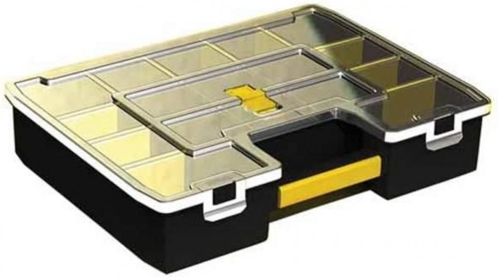 - Speciální design víka zajišťuje pevné držení přihrádek - zabraňuje tak vysypání součástek uložených v přihrádkách organizéru