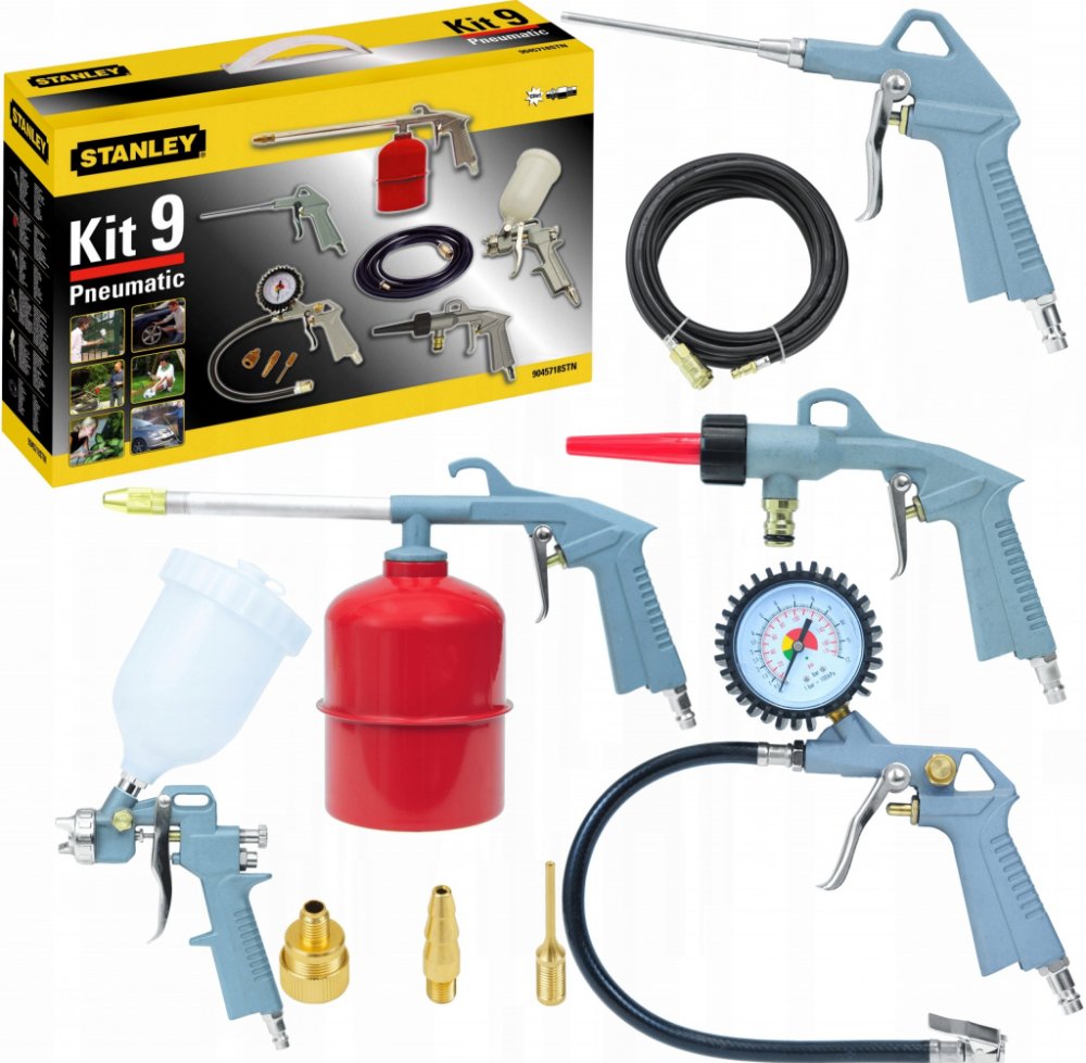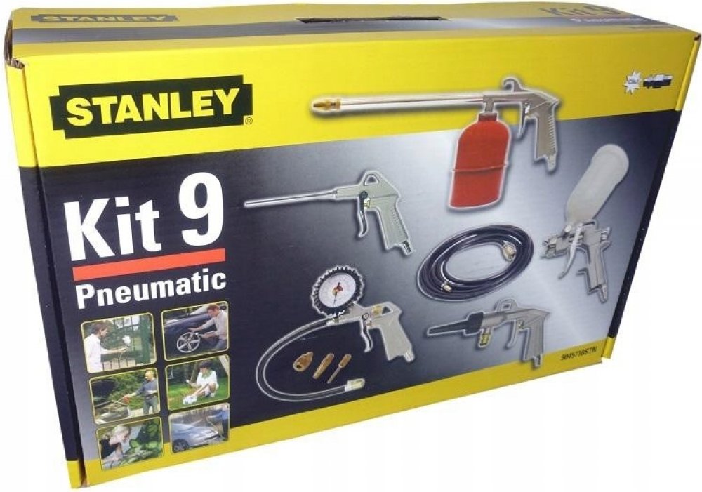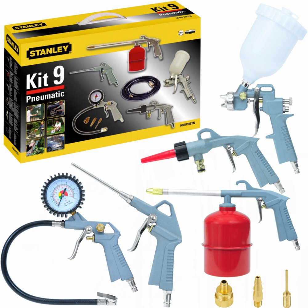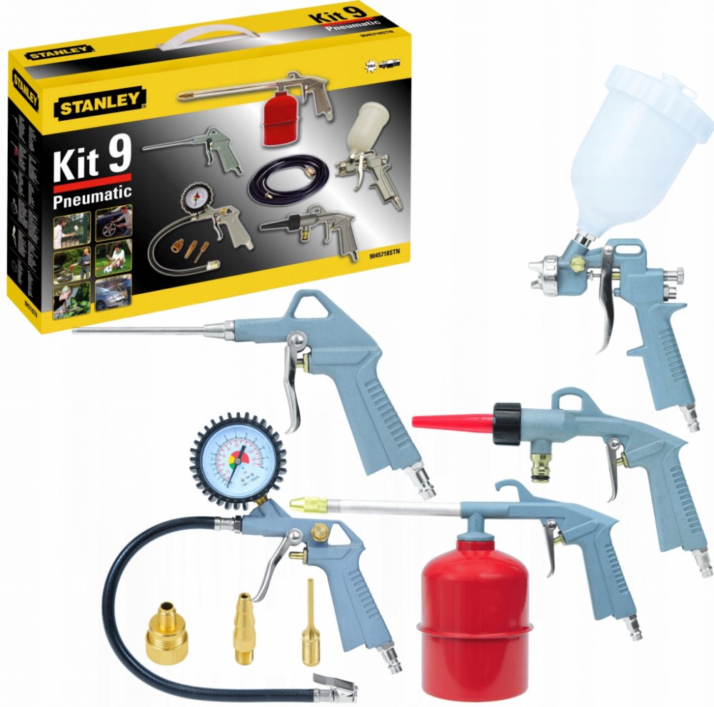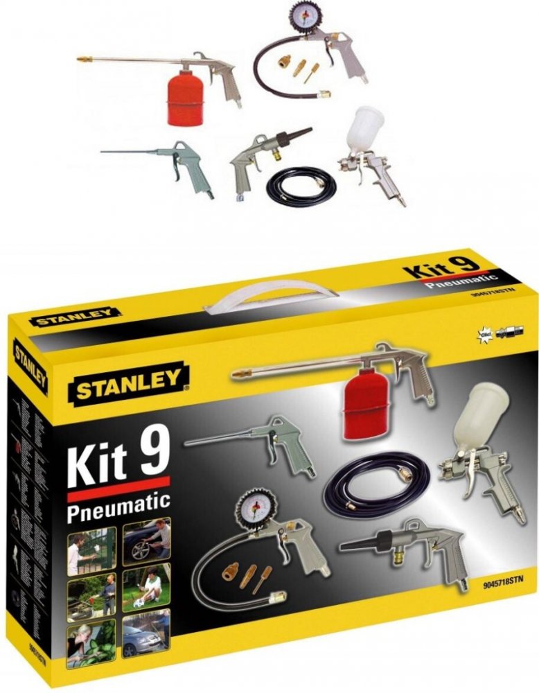 Sada pneumatických pistolí Stanley 9045718STN představuje sadu devíti pneumatických nástrojů a příslušenství pro jejich použití. Jeho součástí jsou mimo jiné: vyfukovací pistole, stříkací pistole, pistole na mytí vodou, lakovací pistole, čerpací pistole. Pneumatické pistole jsou jednoduchá, ale přesná zařízení využívající stlačený vzduch.