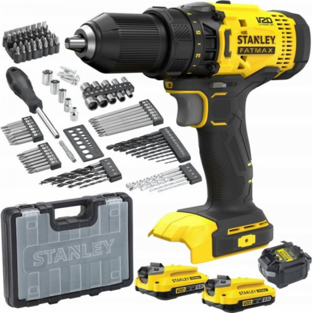 FatMax V20 Aku vrtačka 2 x 2,0 Ah baterie Nabíječka Kufr 100 ks příslušenství