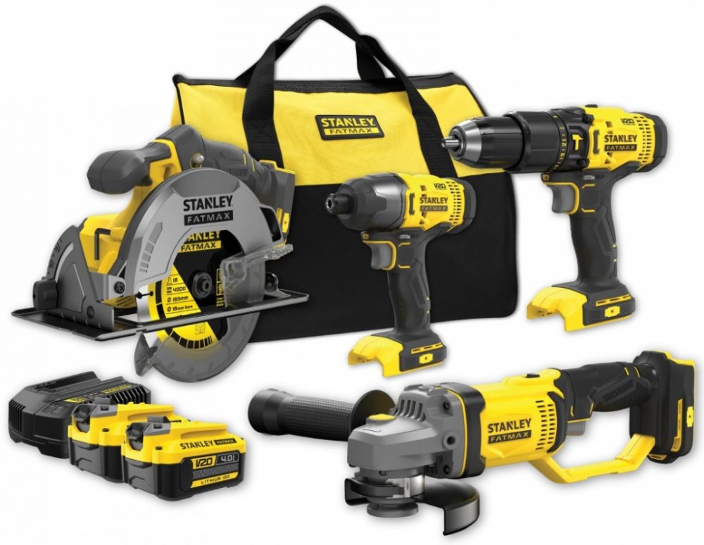 Kombo sada aku nářadí Stanley Fatmax SFMCK469M2-QW obsahuje aku okružní pilu, úhlovou brusku, aku vrtačku s příklepem a rázový utahovák. 2x akumulátor LiIon 4,0 Ah, nabíječku a brašnu