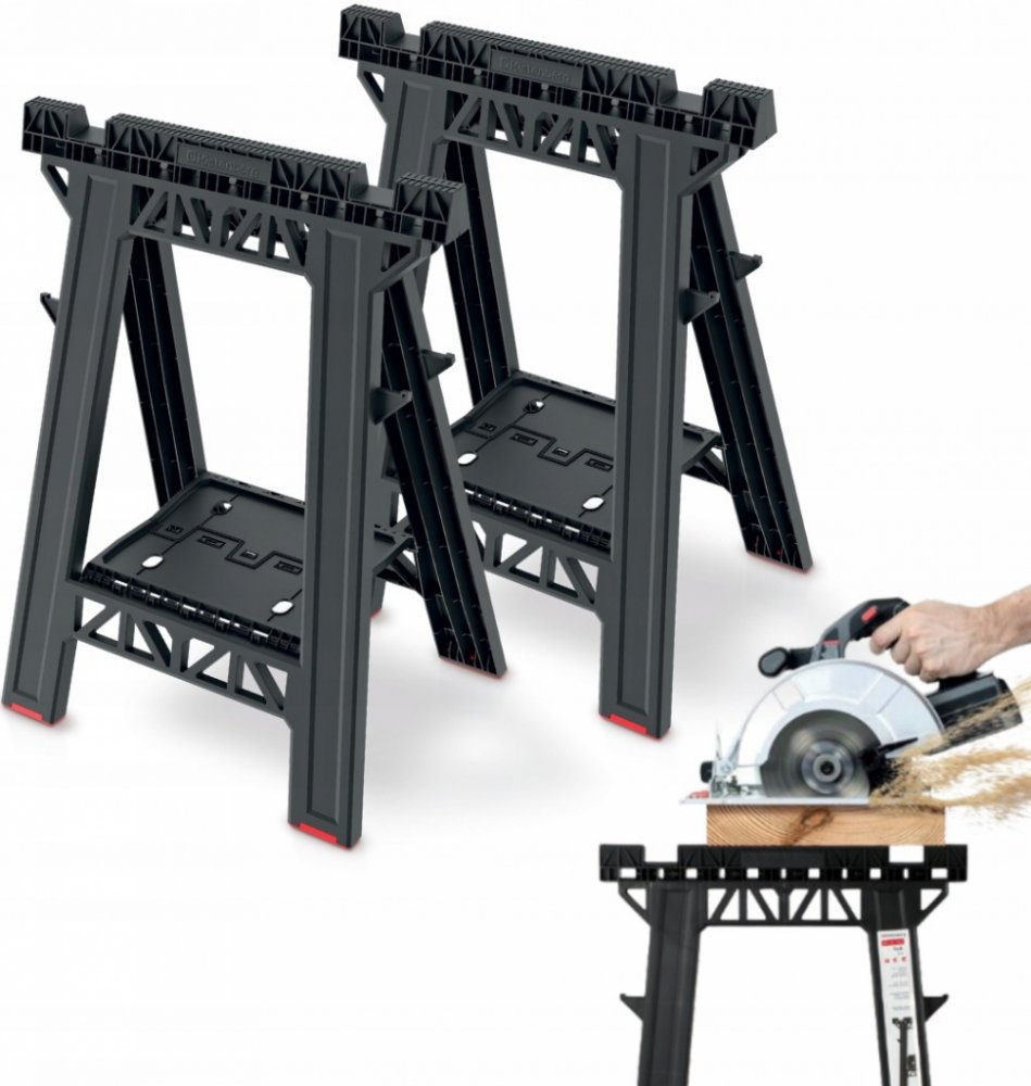 Každý sawhorse je vybaven protiskluzovými gumovými vložkami na vrchní straně, které zajišťují stabilitu a bezpečnost při práci s různými materiály. Navíc gumové nohy přispívají k lepší stabilitě na různých typech povrchů. Díky skládací konstrukci je možné je snadno přenášet a skladovat, což je činí ideálními pro práci na staveništi nebo v dílně.