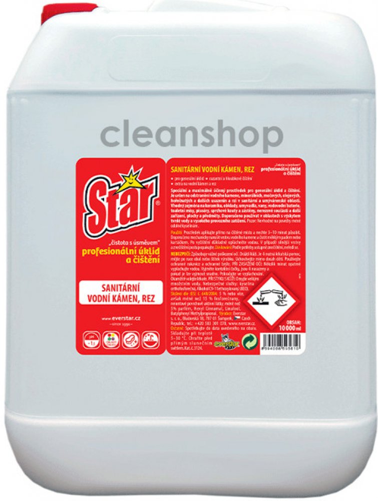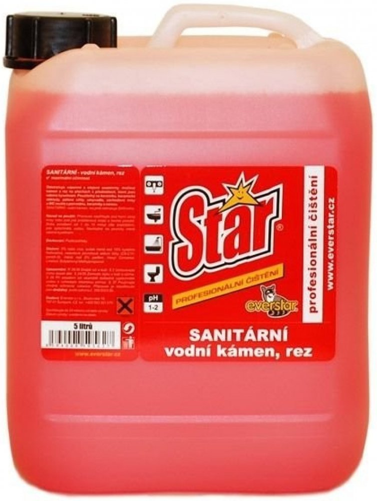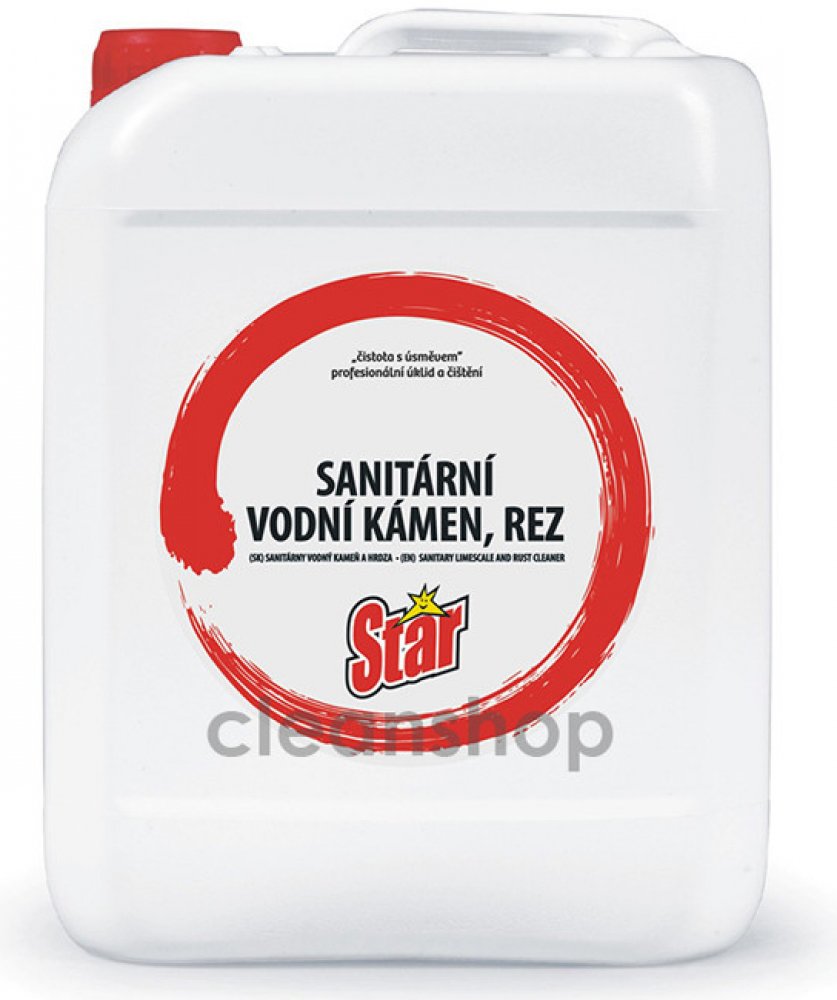 Star sanitární na rez a vodní kámen 5l - velmi účinný přípravek na odstranění rzi a vodního kamene. NELZE OBJEDNÁVAT PŘES ESHOP, POUZE ZA PŘÍPLATEK NA DOTAZ. NELZE OBJEDNÁVAT PŘES ESHOP, POUZE ZA PŘÍPLATEK NA DOTAZ. Odstraňuje vápenné a olejové usazeniny, močový kámen a rez na plochách a předmětech, které jsou odolné kyselinám. Použitelný na kameninu, keramické obklady, pálené cihly, umyvadla, zác...