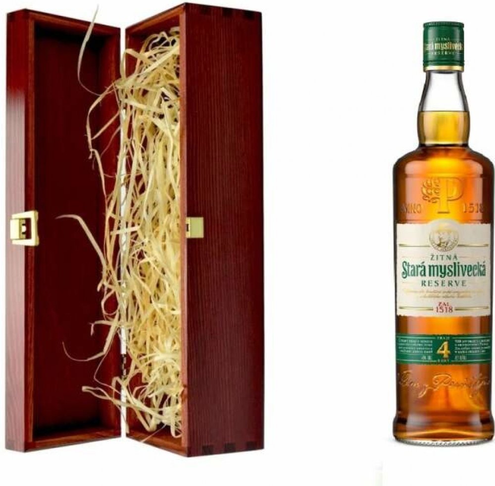 Unikátní výrobní postup dvojího zrání ve vybraných sudech z bílého dubu po dobu čtyř let je to, co odlišuje Reserve od rozšířenější Staré žitné myslivecké. Výsledkem je jedinečná jemná chuť whiskového charakteru s hřejivým dozvukem sadového ovoce.Lahev Staré žitné myslivecké je uložena v dřevěné kazetě a vystlána dřevitou vlnou. Rozměry dárkového balení: 36 x 11 x 10 cm (d x š x v) Krabička je namořena na odstín mahagon a nalakována nezávadným lakem. Díky tomu vyniknou veškeré detaily a léta dřeva, ze kterého byla krabička vyrobena.