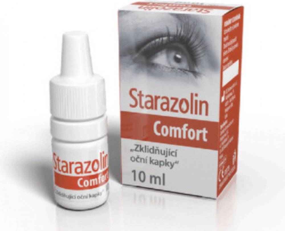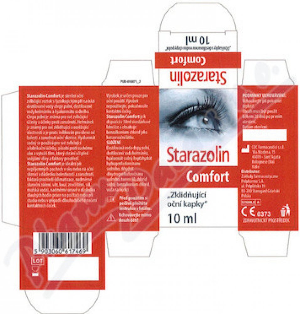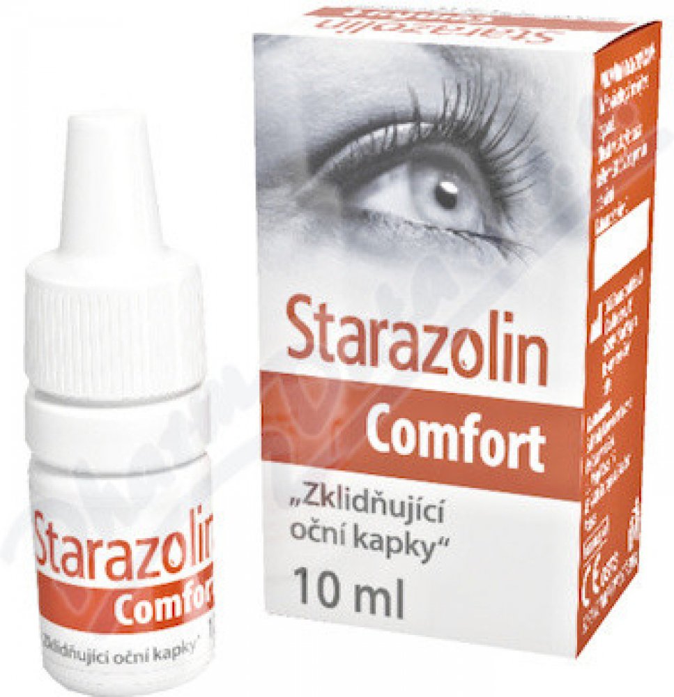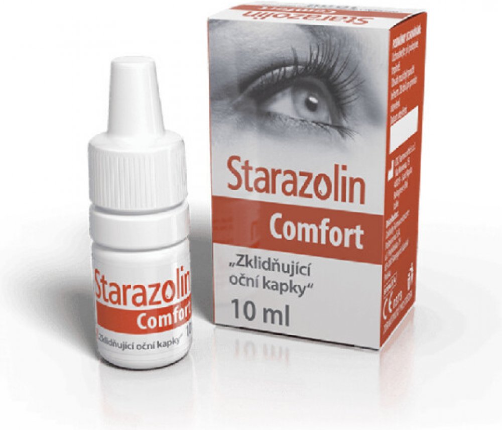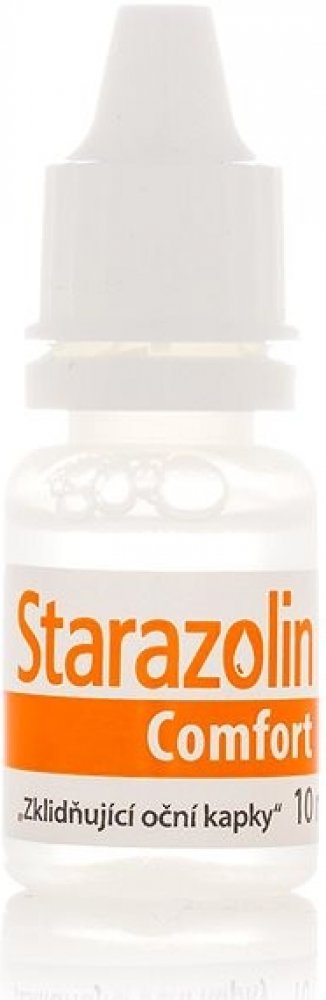 Starazolin Comfort oční kapky je sterilní oční zvlhčující roztok s fyziologickým pH na bázi destilované vody chrpy polní, destilované vody heřmánku a hyaluronátu sodného. Chrpa polní je známa pro své zvlhčující účinky a účinky proti zarudnutí. Heřmánek je známý pro své zklidňující a osvěžující vlastnosti a je proto indikován pro úlevu od bolesti a zarudnutí oční sliznice. Hyaluronát sodný se použí...