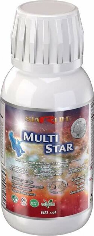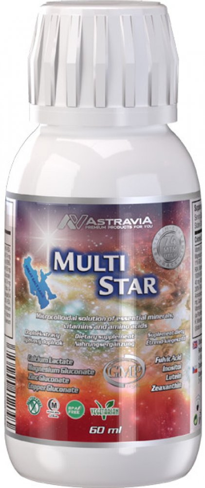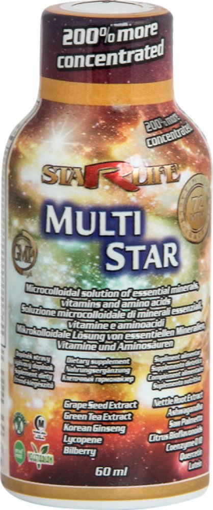 MULTI STAR slouží pro doplnění minerálů, stopových prvků, vitaminů, esenciálních aminokyselin a enzymů. Jedná se mikrokoloidní roztok, kdy každý minerál je uzavřen v lipidovém obalu společně s optimálním nosičem, čímž je dosažena 92% biovyužitelnost (vstřebatelnost). Všechny složky jsou ve vyváženém poměru, který zabezpečuje optimální působení na organismus. Obsažené bylinné složky podporují celkovou využitelnost a působení. MULTI STAR je nezbytným doplňkem k udržení funkcí biosystémů. Roztok je zcela zbaven těžkých kovů.