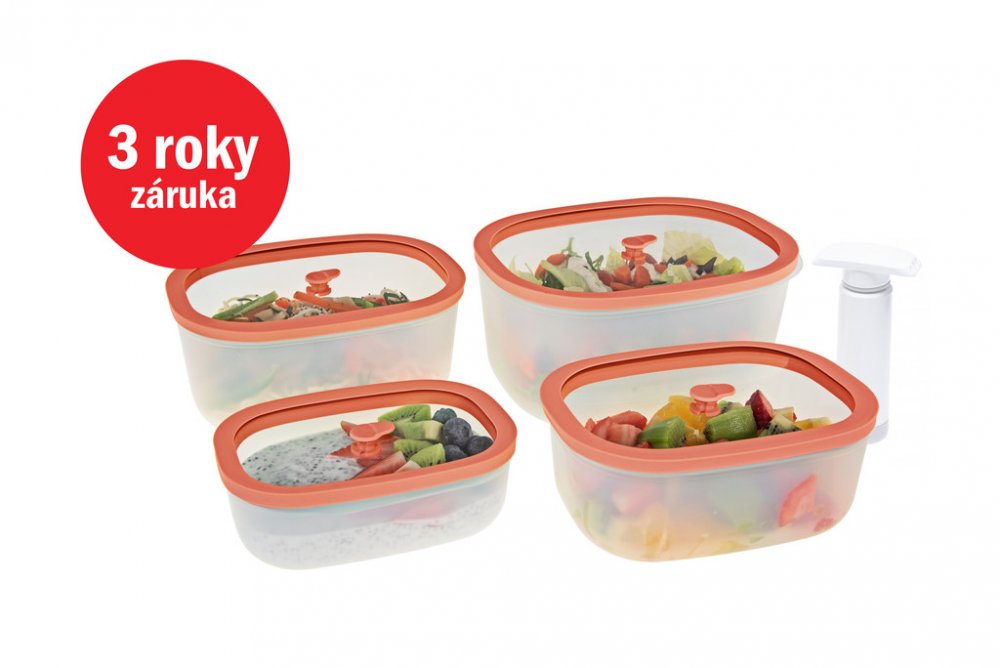 Klíčové vlastnosti produktu STATUS 177110 Fresko 5 dílný set vakuových dóz lososová Vakuové dózy STATUS jsou ideální k uskladnění potravin Zaručují delší trvanlivost jídla Pomohou s uspořádáním domácnosti Díky nim budete mít potřebné potraviny na dosah Praktická obdélníková konstrukce dóz Plastové dózy mají nízkou hmotnost a nabízí jednoduchou údržbu Víko ze skla utěsní každou dózu a poskytuje ochranu obsahu před okolními vlivy Víka dóz jsou nasazovací Dózy na potraviny jsou vhodné do mikrovlnné trouby, myčky a mrazáku Dobře těsní, což zaručuje bezpečné uzavření obsahu Bez přítomnosti škodlivého BPA